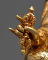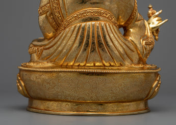 Accept the great beauty and spiritual depth of this Guru Rinpoche Puja Statue, an artistic expression and craftsmanship masterpiece. Guru Rinpoche, often regarded as the embodiment of Tibetan spirituality, emanates a sense of peace and ageless wisdom in this work. Each curve and contour is enhanced with a bright 24k gold gilding, crafted with great attention to detail. The hand-painted acrylic embellishments lend depth and vitality to this statue, transforming it from a spiritual symbol into a piece of art. This item is anchored on a robust copper body and is intended to be a treasured keepsake for generations.