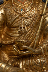 Guru Rinpoche is depicted seated in a moon-disc lotus seat, holding the vajra with the right hand, symbolizing strength and power in a semi-wrathful expression. On the left hand, he is holding a skullcup. In addition, he is holding Katang on the left shoulder. This statue is an impressive representation of the powerful Guru Rinpoche, flawlessly hand-carved by the artists.