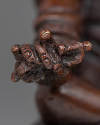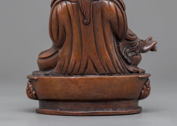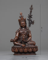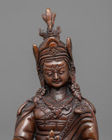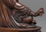 We have meticulously hand-carved this classic oxidized copper Guru Rinpoche statue in our studio. In the statue, the Lotus-Born is depicted regally seated atop a moon disc lotus seat holding a vajra in his left hand and a skull vase with a jar of immortality in his left. In the arc of his left hand, he holds the Khatvanga trident, his celestial ally of bliss and emptiness. The statue has the elegance of antiquity because it is made of oxidized copper.
