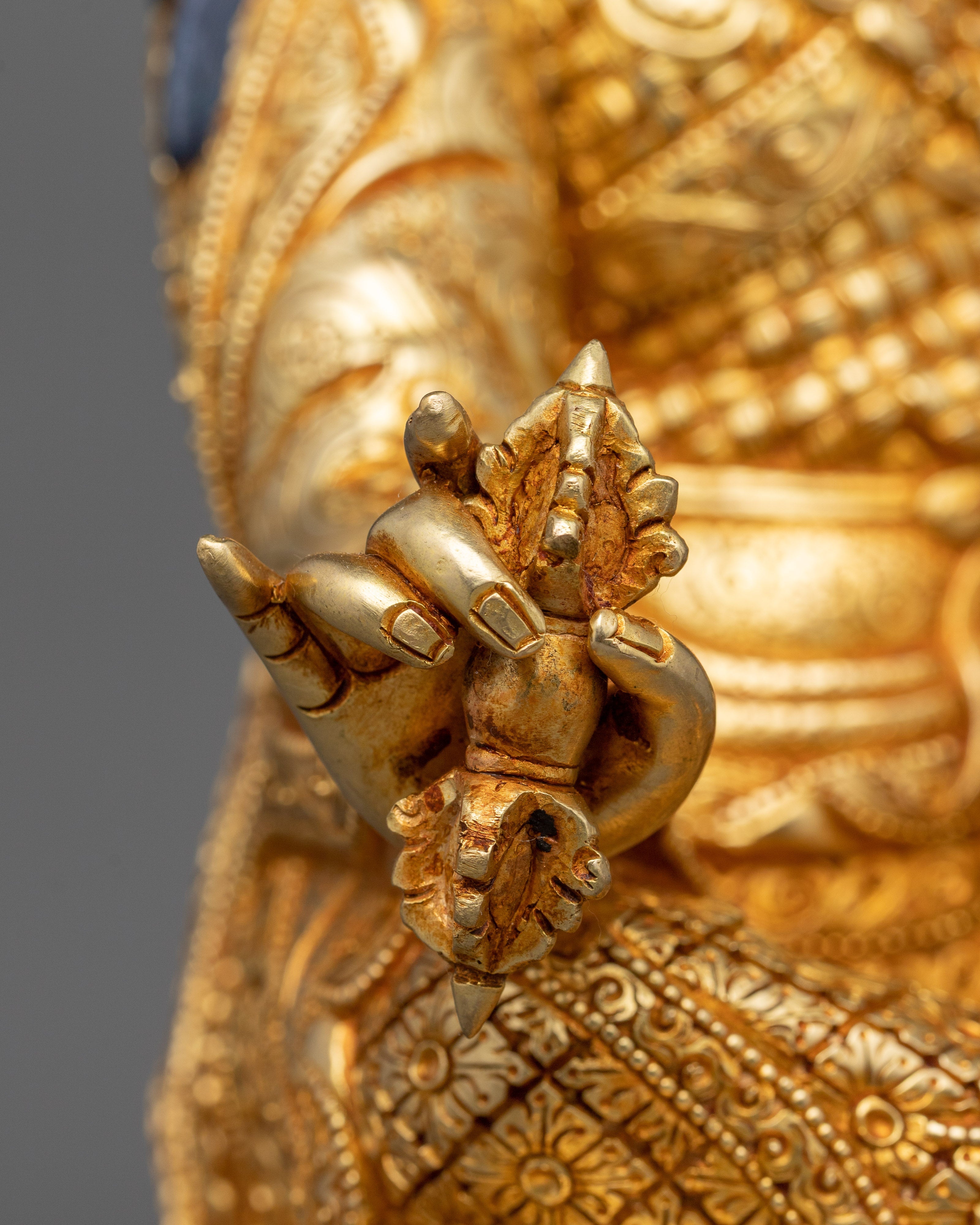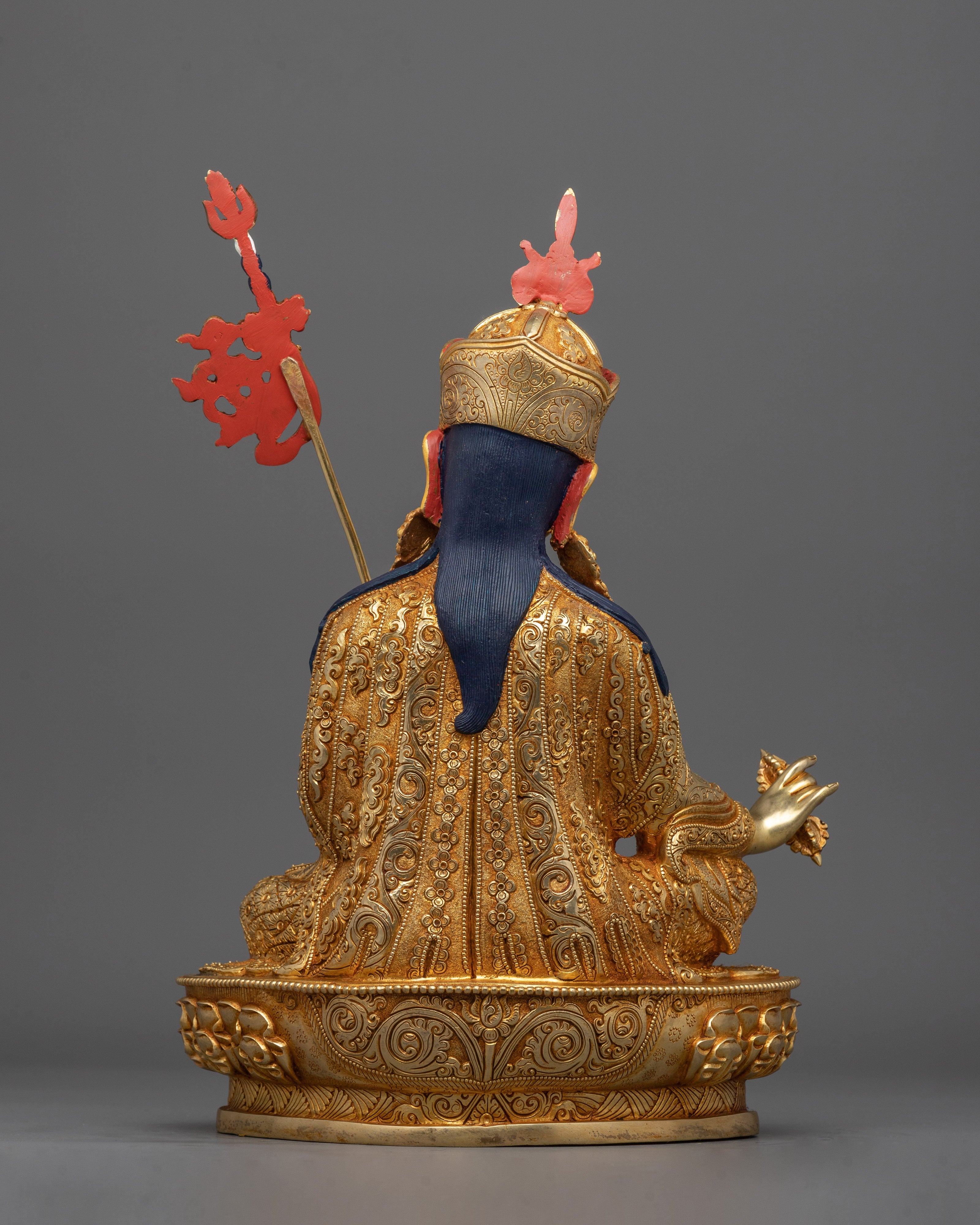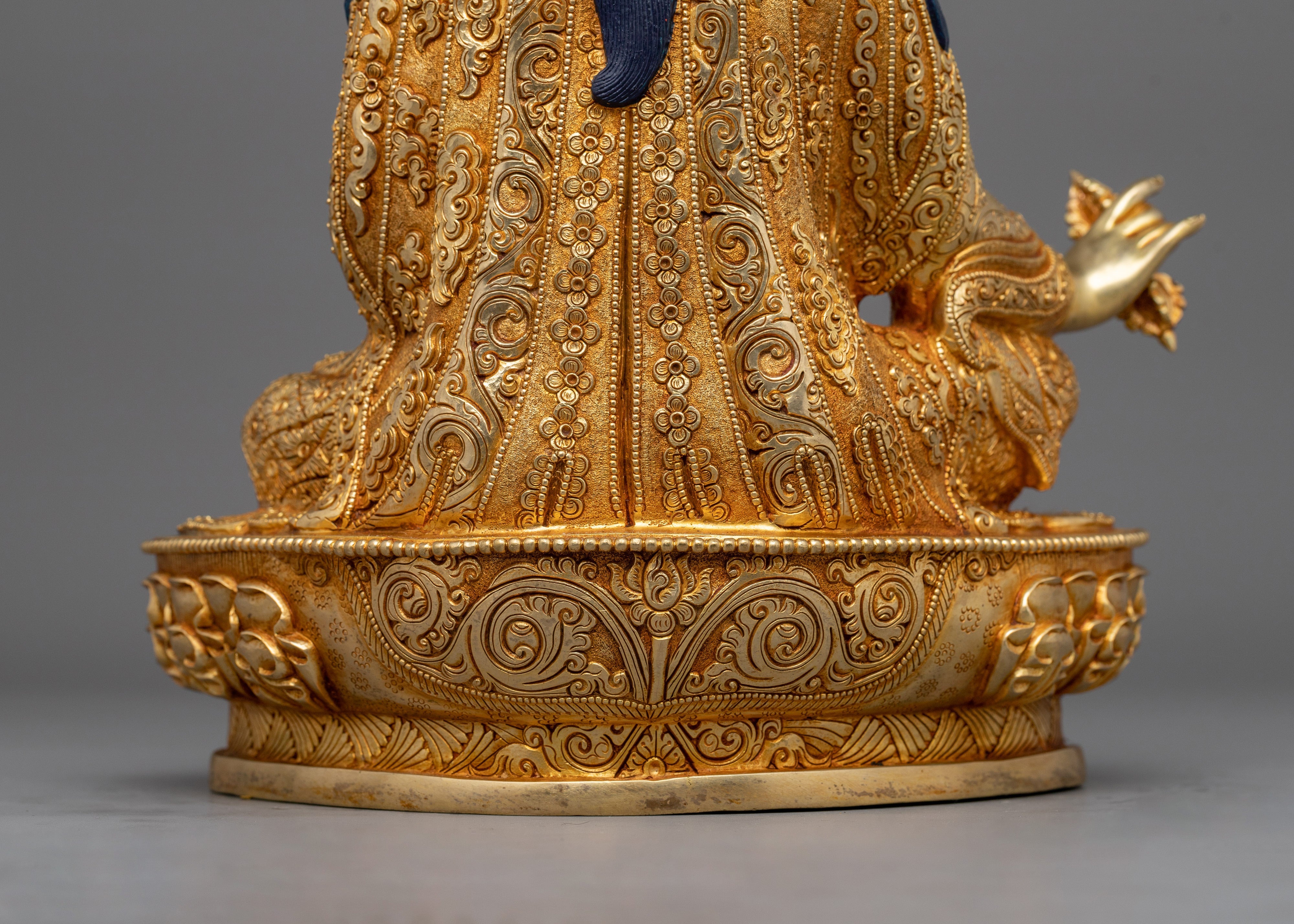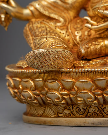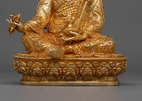 This 24K gold-gilded statue represents spiritual purity and enlightenment, with meticulous gold and acrylic painting that highlights the figure's heavenly beauty and complex characteristics. Its copper body provides durability while conveying the essence of Padmasambhava's knowledge. His right-hand holds a vajra (thunderbolt), indicating his ability to eliminate ignorance and negative energy, while his left-hand holds a skull cup (kapala) filled with the nectar of wisdom. The khatvanga, a trident adorned with symbolic components representing his tantric accomplishment and the unification of wisdom and compassion, rests on his left shoulder. The statue's powerful symbolism, intricate craftsmanship, and spiritual artwork make it an appealing focal point for meditation and devotion.
