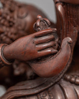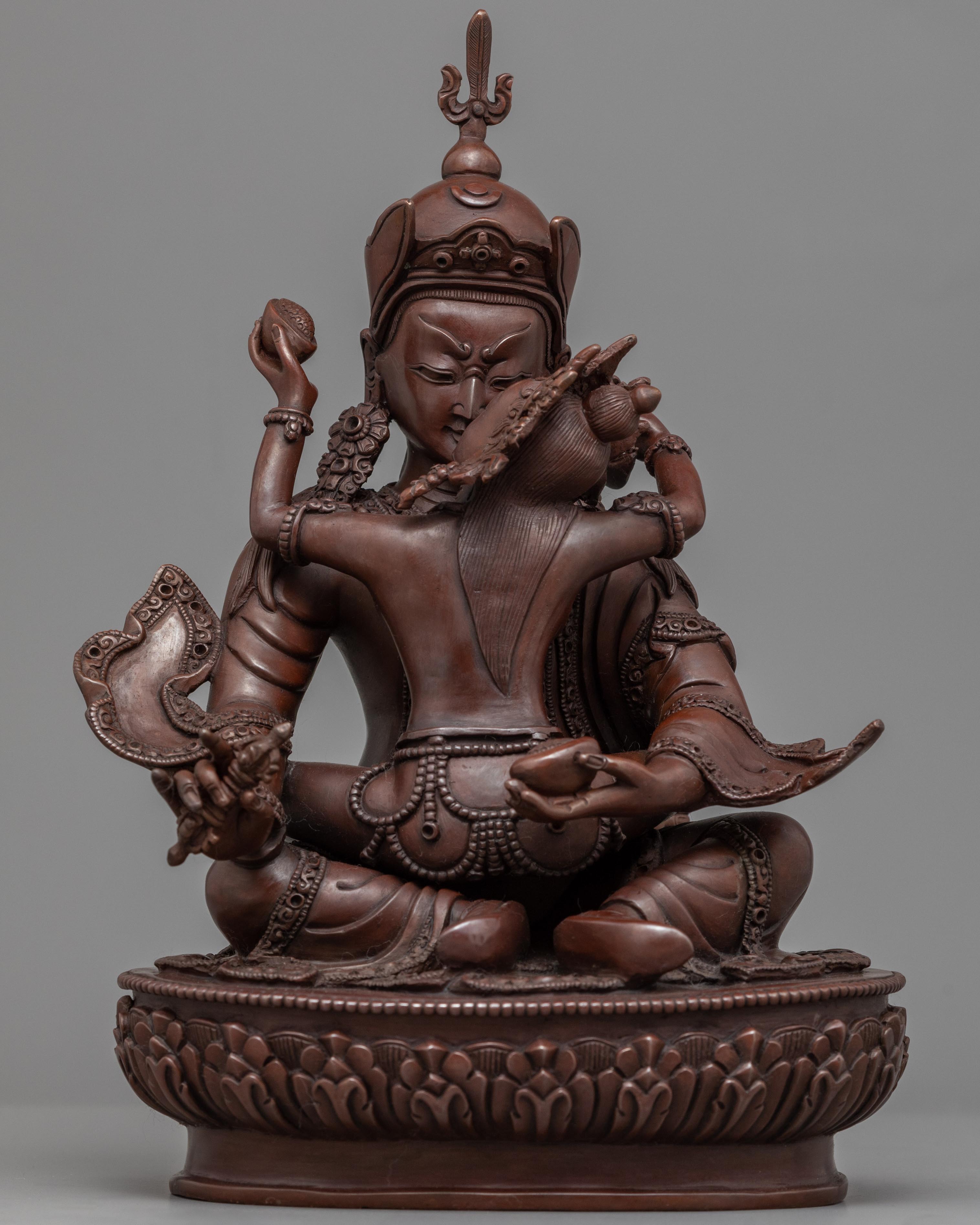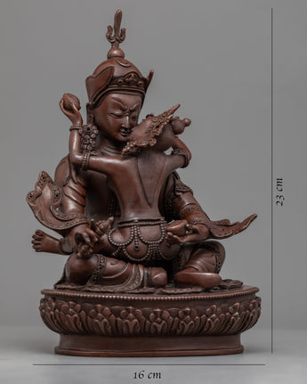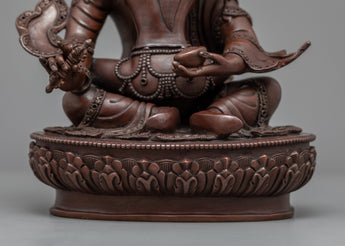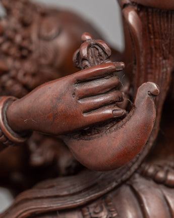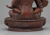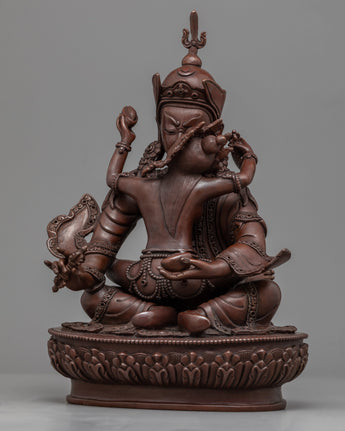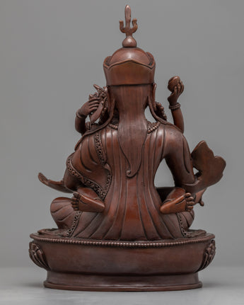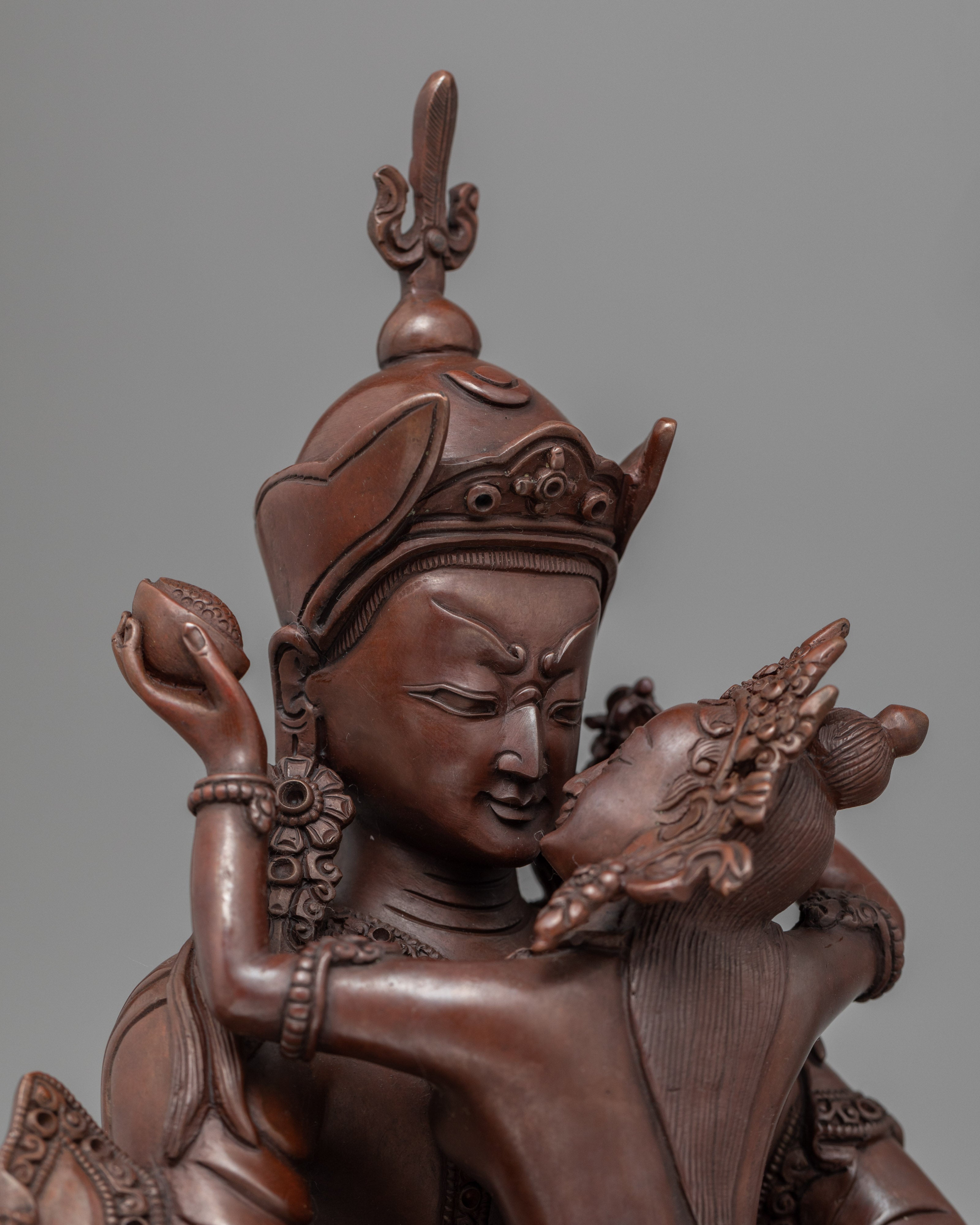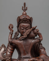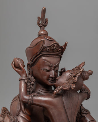 Our Traditionally made oxidized Statue of Guru Rinpoche with Consort is homemade, entirely by hand by Master Artisan. Guru Rinpoche is depicted seated firmly on a lotus seat while the consort is seated on guru rinpoche's lap, facing her back toward us. Guru Rinpoche clutches a vajra in his right hand and a skullcap in his left. His consort is seated on his lap, embracing him with her right hand while holding a flaying knife (Kartika) and a skullcup in her left. Our artisan has kept the design simple and accurate while adding all the necessary details. The molding of the copper body and intricate design pattern took our master artisan months of total dedication to complete the statue.