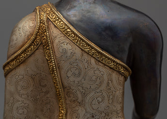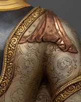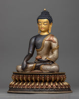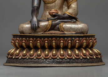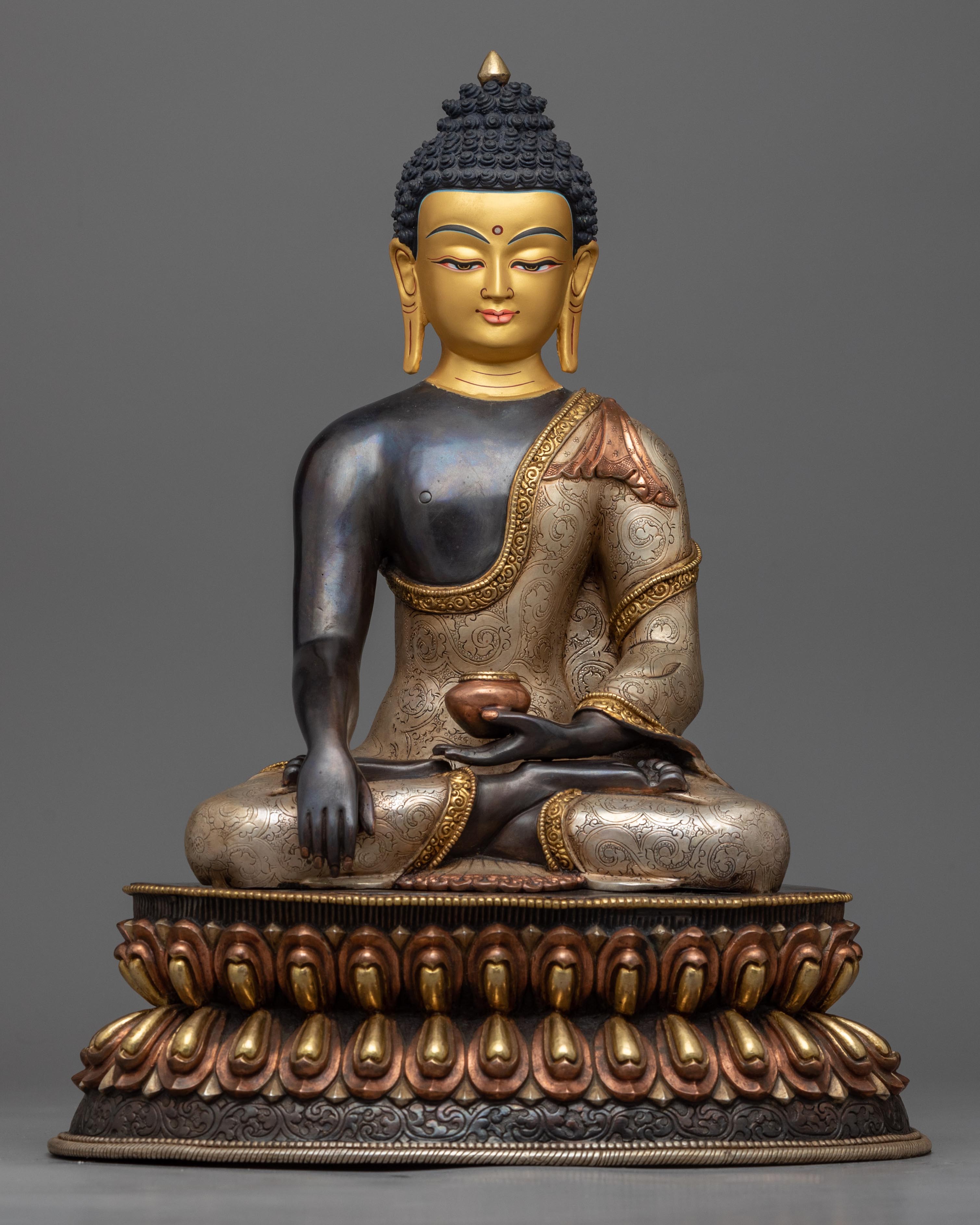 We have masterfully hand-carved the Buddha Shakyamuni statue in the traditional Himalayan style. Crafted from an oxidized copper body and partially gilded with 24k genuine gold, which highlights the intricate design patterns of the statue are highlighted. The historical buddha is depicted seated atop a moon disc lotus seat with an alms bowl over his lap on his right hand with his characteristic calm and peaceful appearance. He performs the 'Bhumisparsa Mudra' with his left hand, representing one of the most important moments of Buddha's life, i.e. when the Buddha achieved enlightenment as he claimed the earth as his witness for it.