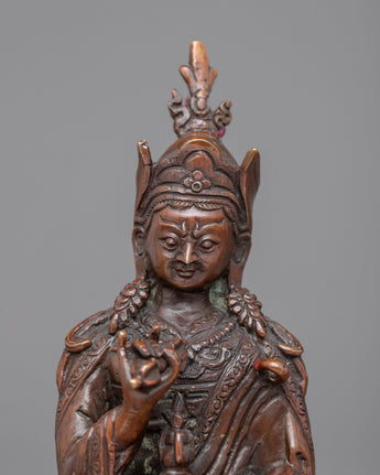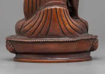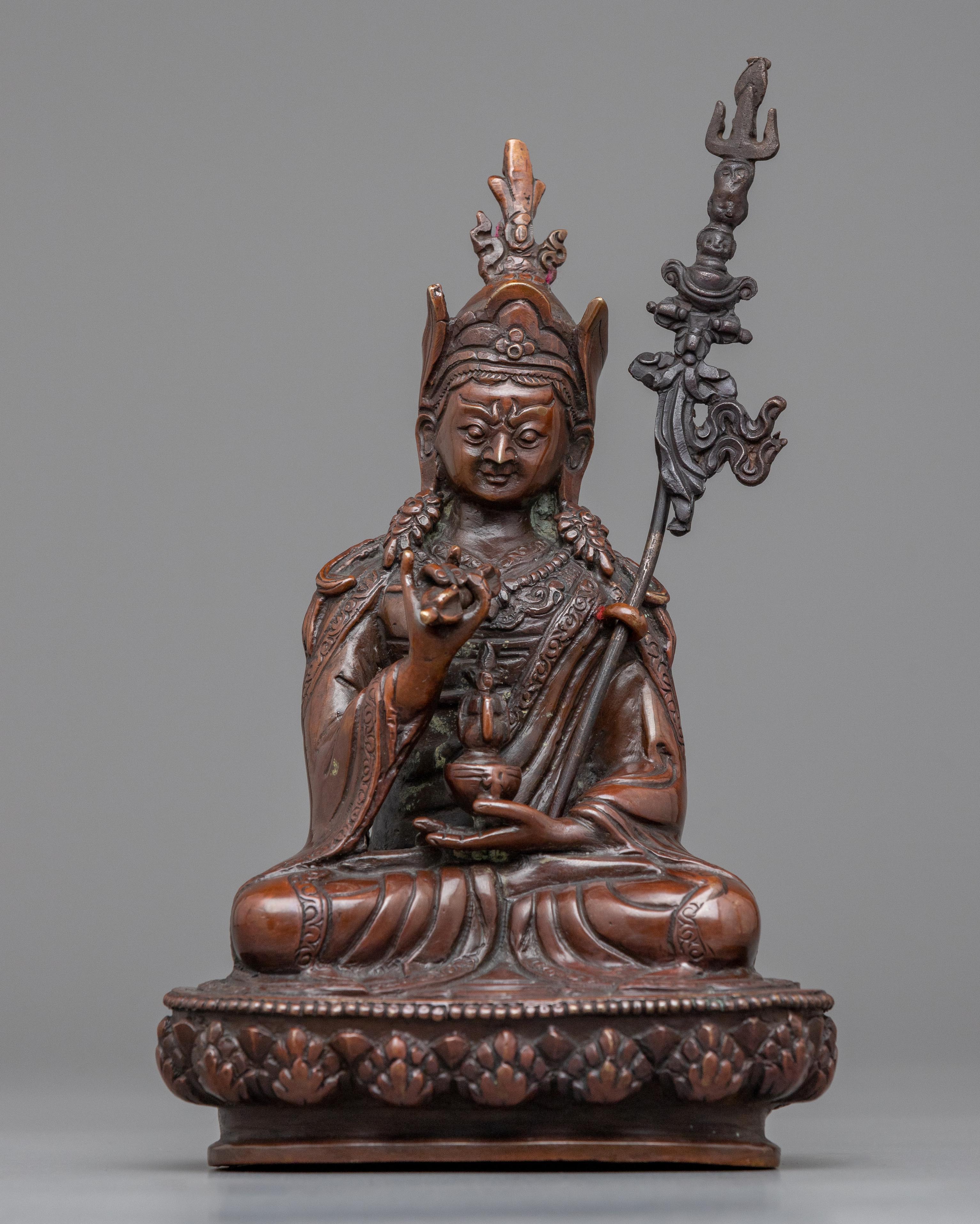 The Guru Rinpoche statue is an intricately handcrafted piece produced in our studio and designed with unique Nepali motifs. Depicted with a semi-wrathful appearance, the Lotus-Born majestically sits on a moon disc lotus seat with his left foot extending forward while holding a vajra and a skull vase with a jar of immortality in his left and right hand, respectively. He can be seen wearing his signature lotus hat, a symbol of spiritual purity, with his celestial ally of bliss and emptiness, the Khatvanga trident, in the arc of his right hand. The statue is comprised of oxidized copper, providing it with the elegance of antiquity.