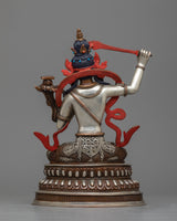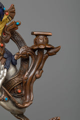 With the Wisdom's Beacon: Handcrafted Manjushri Statue, you can uncover the essence of wisdom and insight. This statue depicts the Bodhisattva of Wisdom. The great spiritual significance of Manjushri, whose transcendent wisdom scripture lights the road to enlightenment and whose sword of wisdom cuts through ignorance and delusion, is echoed by this painstakingly sculpted statue. The statue, which has an oxidized copper body with silver plating, is enhanced with gold and acrylic paintings that capture Manjushri's enlightened presence.