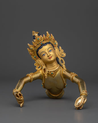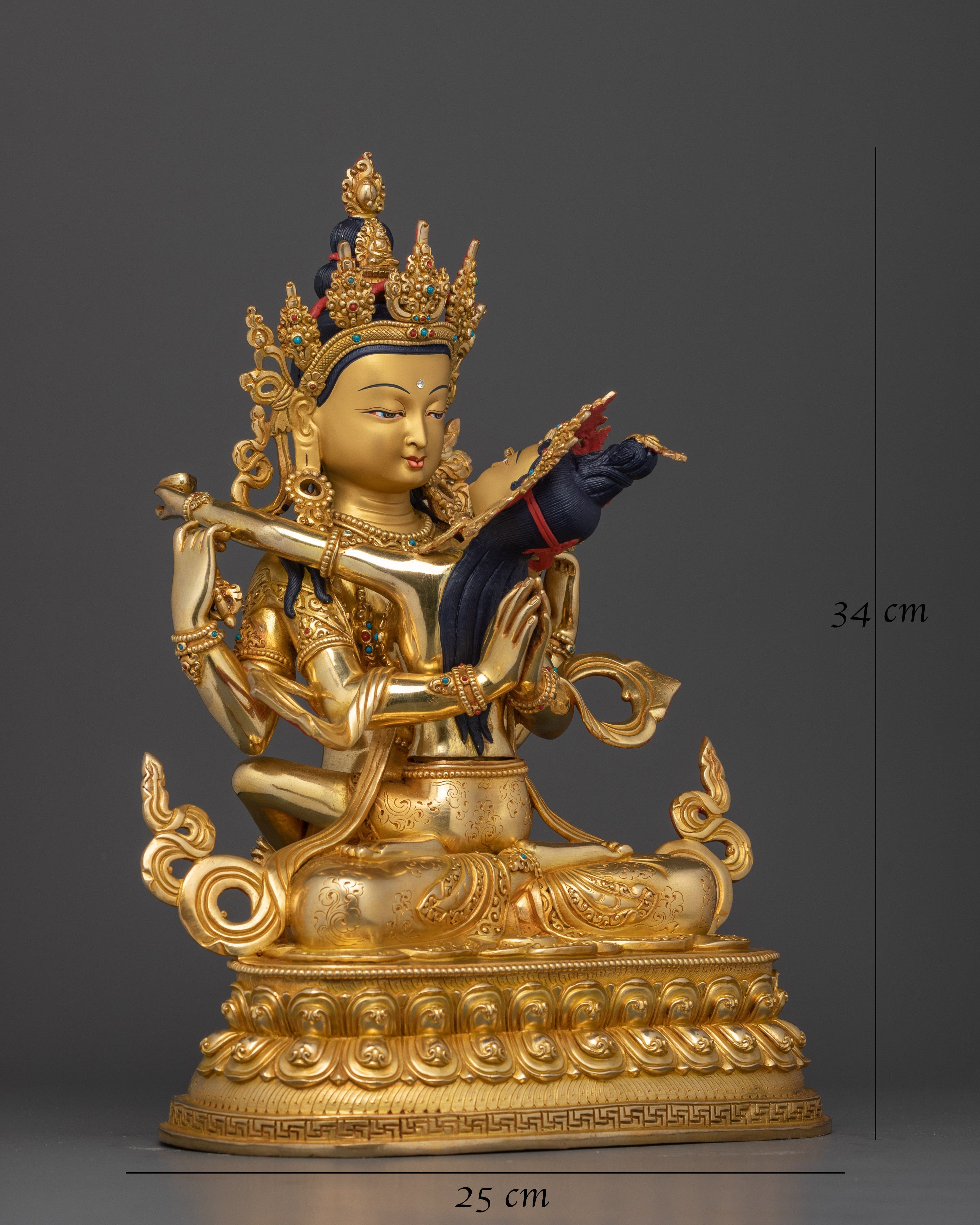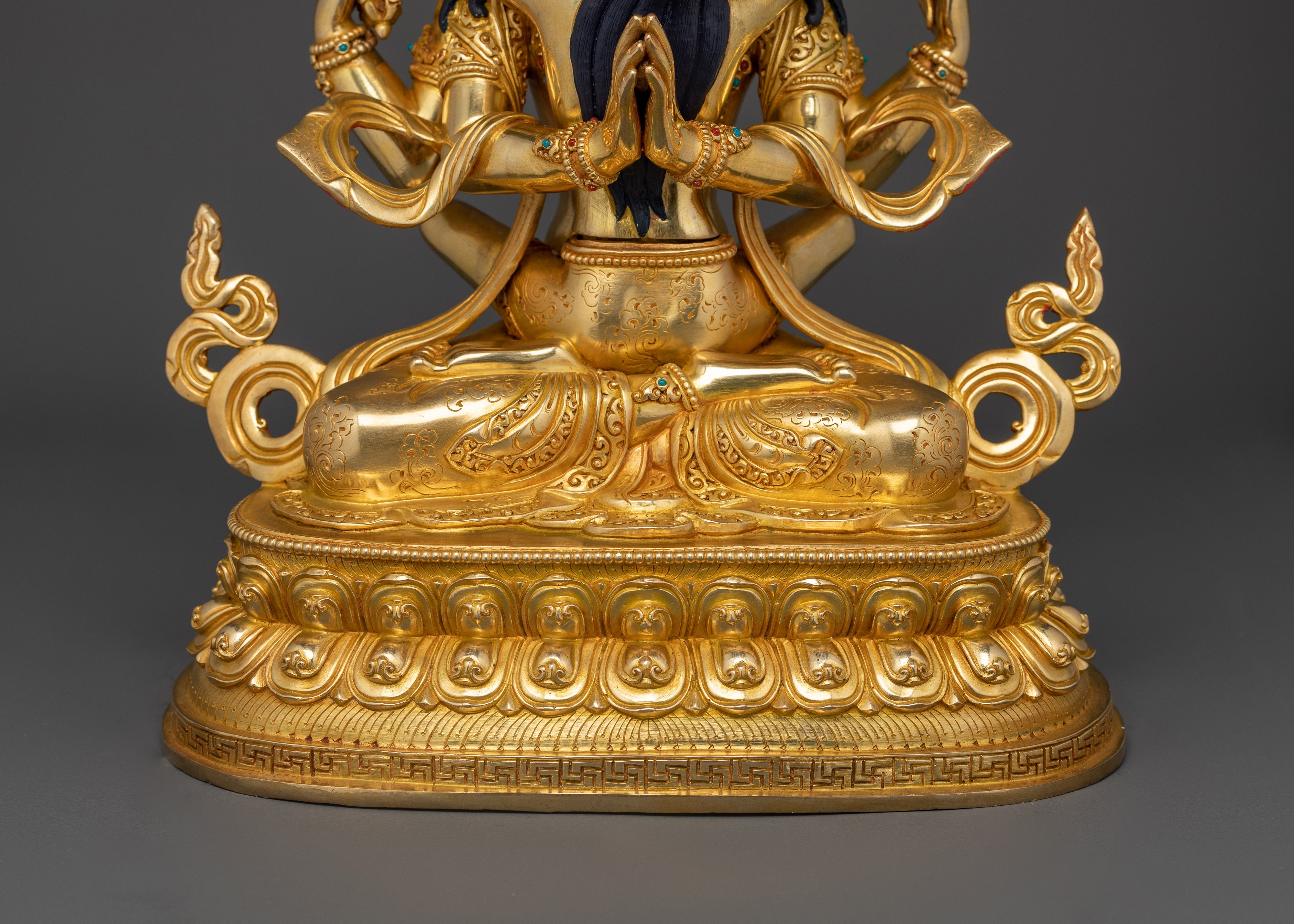 This Red Chenrezig with Consort statue is a stunning creation from the skilled artisans of Patan, Nepal, a city renowned for its expertise in crafting spiritual sculptures. Made from premium copper and adorned with 24K gold gilding, this statue is a true reflection of master craftsmanship. Every detail is carefully hand-carved, from the compassionate expression on Chenrezig’s face to the intricate details of his consort, highlighting the unity of compassion and wisdom.