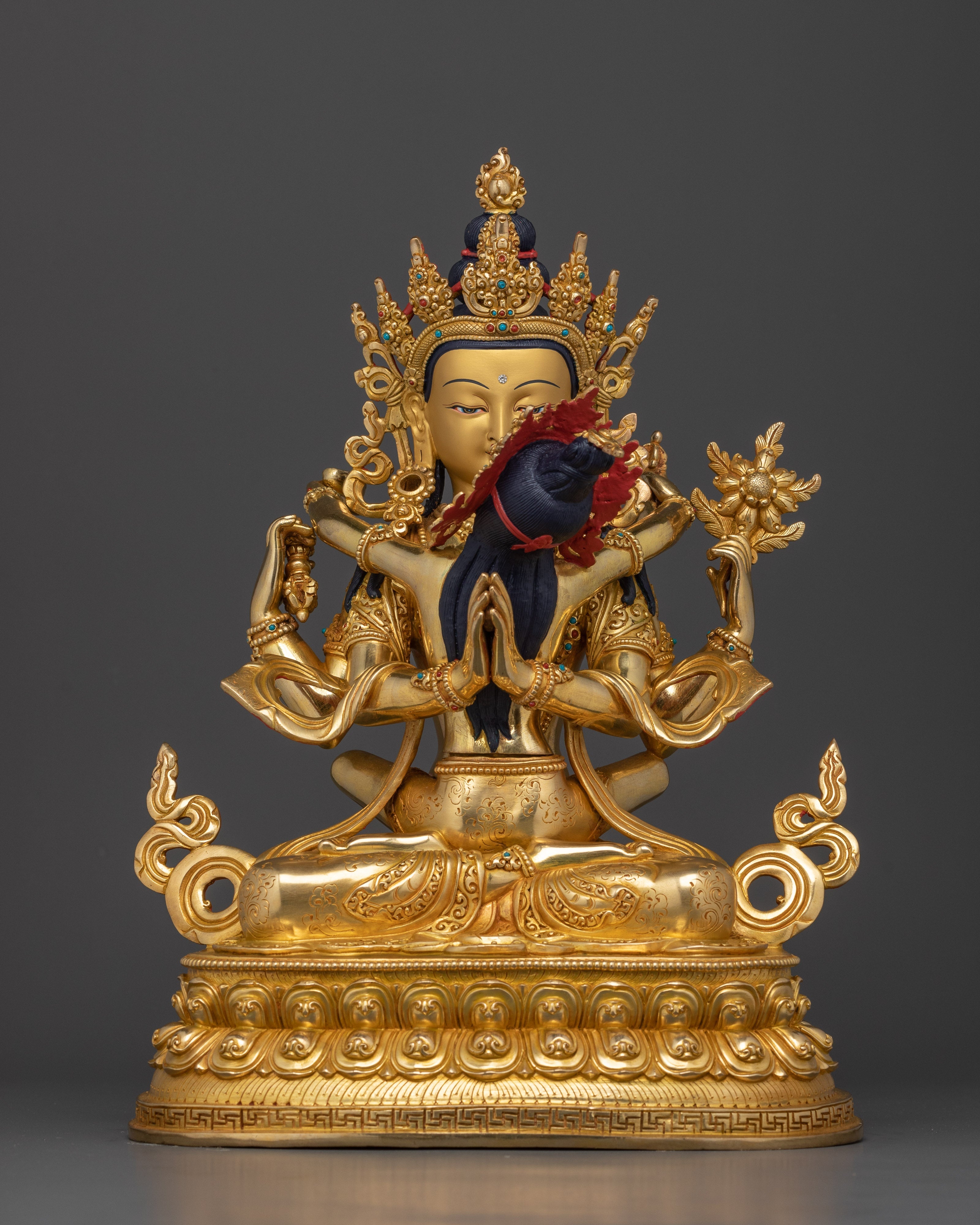 The red chenrezig Buddha sculpture is depicted with a consort Dorje Phagmo holding a skull cup and himself sitting on a moon-disc lotus throne. A crystal rosary in the upper right hand represents the never-ending cycle of life, death, and regeneration. The upper left-hand holds a lotus, symbolizing the deity's role in helping mankind escape adversity and unfavorable conditions, including hellish realms. The lower hands are softly placed in a namaste motion, clutching a wish-fulfilling Jewel. The deity's peaceful and calm visage conveys compassion and tranquility.
