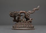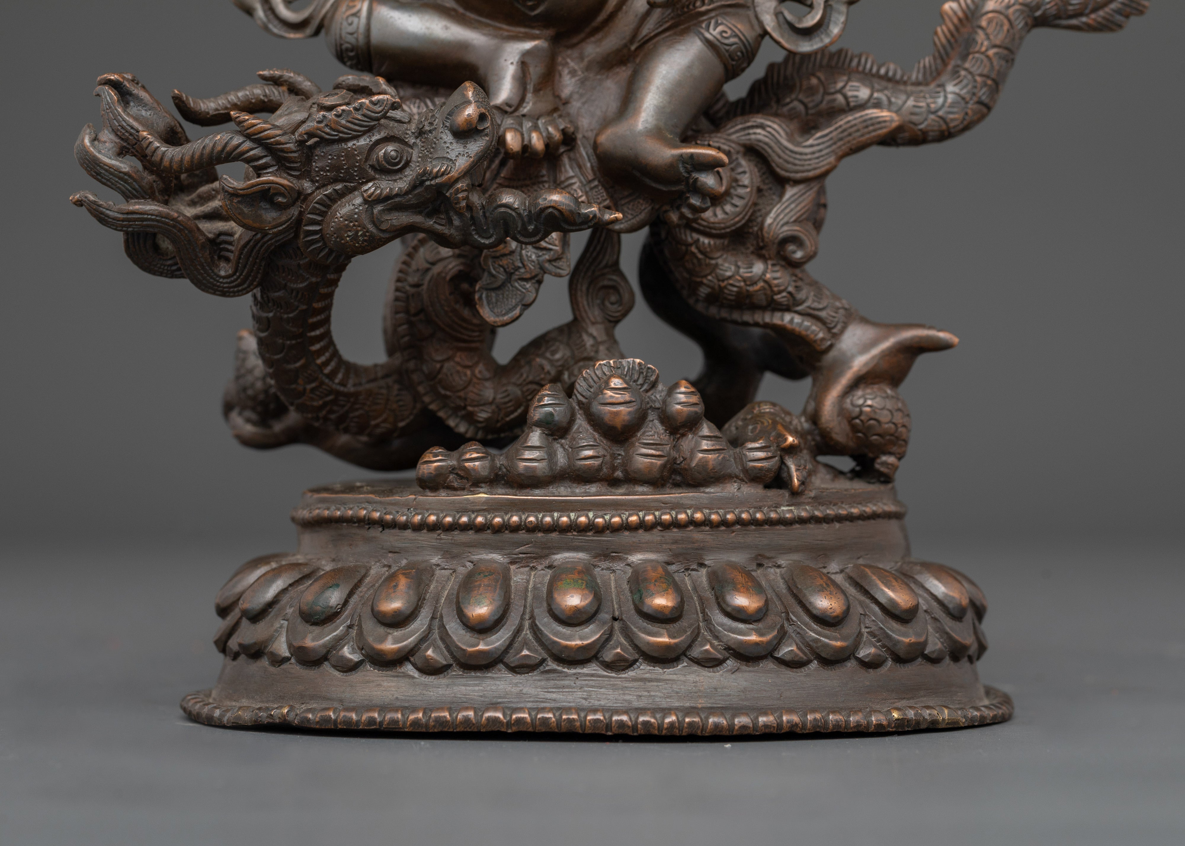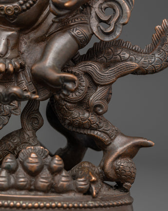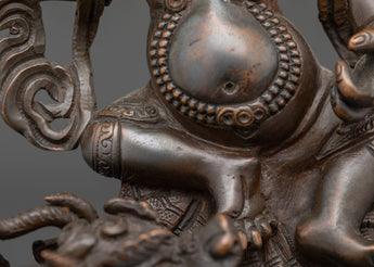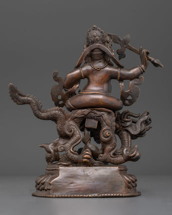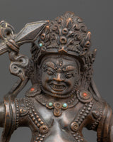 This intricately handcrafted White Dzambhala statue, made from oxidized copper, exemplifies the traditional metalworking art of Patan, Nepal. The oxidized finish provides the statue with a rich, antique-like patina, giving it a timeless appearance. This finish not only enhances the visual appeal but also symbolizes the ageless wisdom Dzambhala offers to practitioners, adding depth to its spiritual resonance. Crafted by highly skilled artisans, the detailing on this statue—from the serene expression to the flowing robes—reflects centuries of mastery in copper craftsmanship.