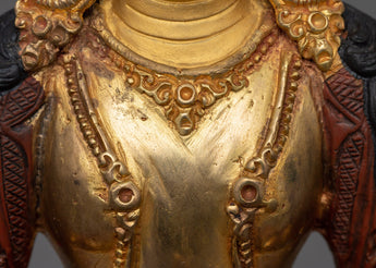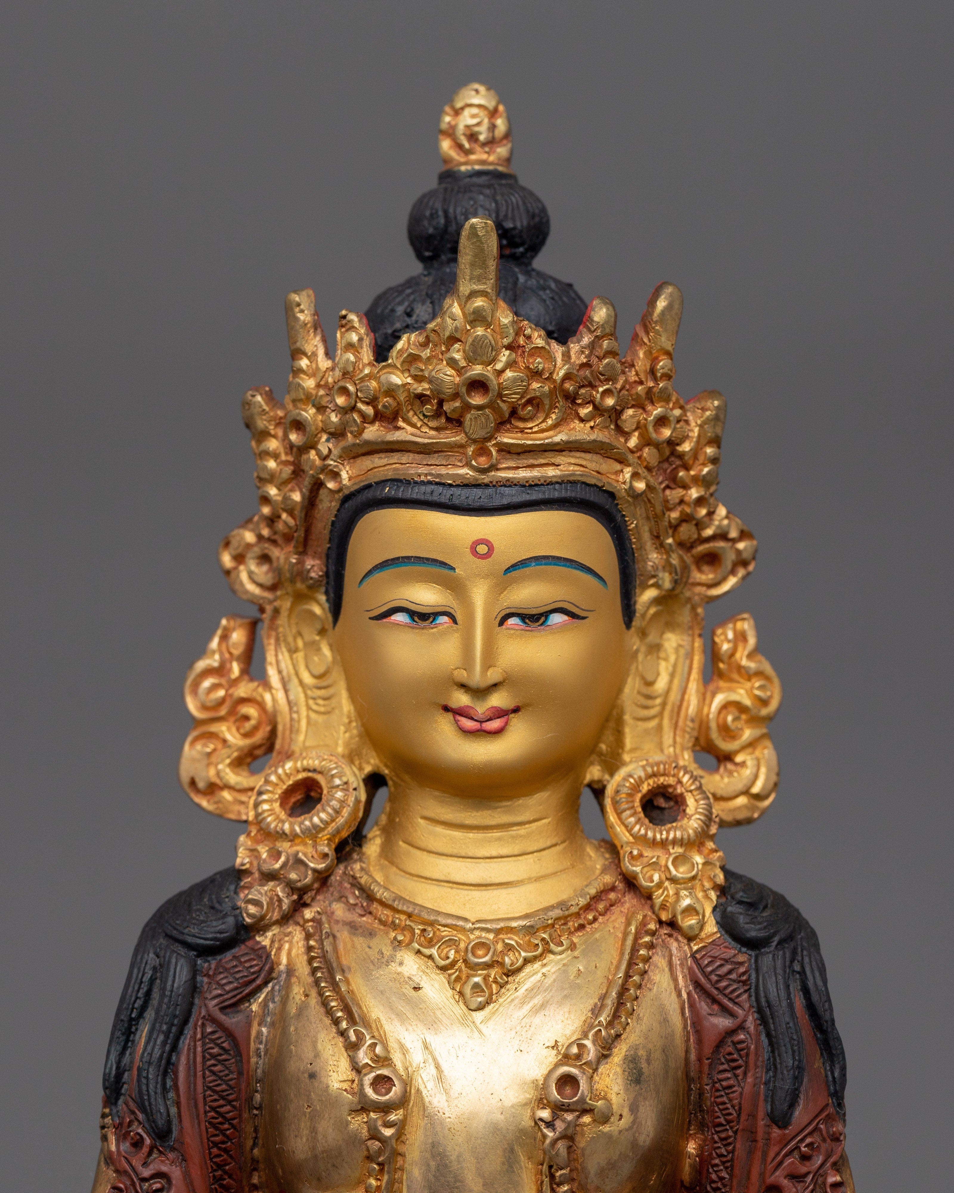 This Buddha Amitayus Kadampa Statue embodies the qualities of longevity, vitality, and infinite wisdom. It is sculpted from oxidized copper and embellished with 24K gold gilding as well as gold and acrylic paintings, expressing a spiritual aura. The Kadampa design conveys this piece with a sense of simplicity and commitment, making it appropriate for individuals associated with this treasured tradition. This statue is a constant reminder of life's spiritual abundance and infinite kindness.