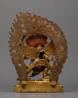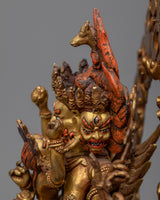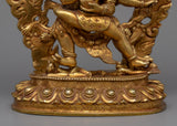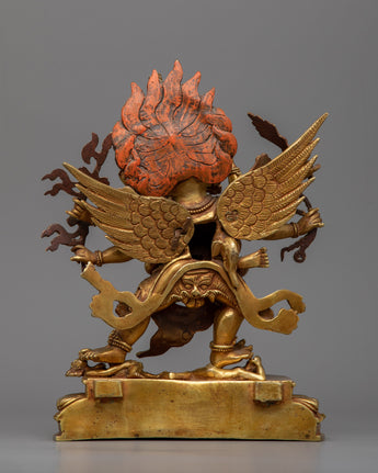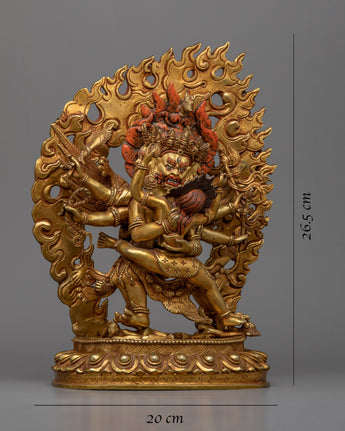 Intricately handcrafted in our workshop, the traditional Hayagriva mantra practice statue is full of unique Himalayan artistry. The copper body of the statue is gold gilded, which provides the statue with its luster and brilliance. The deity is depicted with a wrathful appearance standing over a human figure, signifying the triumph of good over evil. He wields a sword in his left hand and a noose in his right hand. He wears a skull garland over his neck as he is engulfed in fiery flames representing his transformative power and ability to purify negative energies. The statue is full of intricate patterns and motifs that our artists carved out over the course of several months.