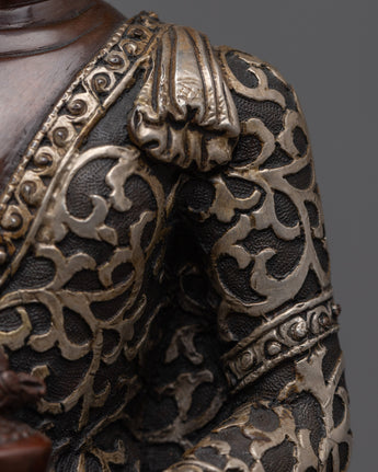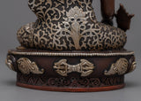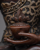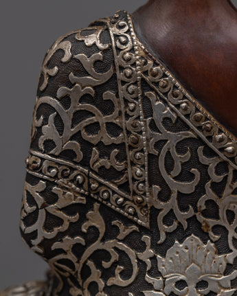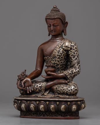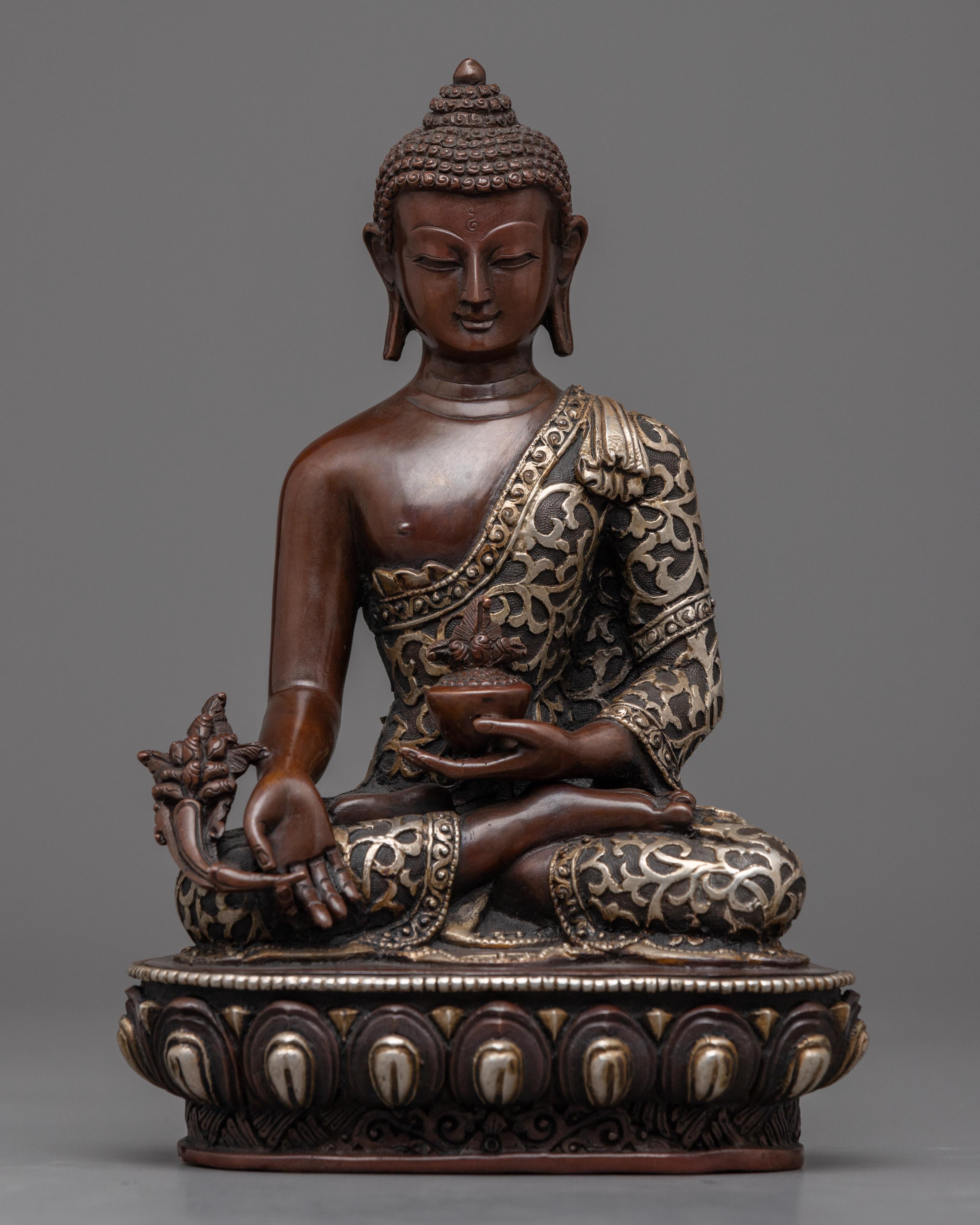Meticulously handcrafted in our workshop by our traditionally trained Vajrayana artists, this healing medicine buddha statue is intricately designed with unique Nepali patterns. The Buddha is depicted sitting on a moon disc lotus seat, exuding serenity and tranquility. He can be seen carrying an alms bowl bearing the nectar of immortality in his right hand and a myrobalan flower in his left. This statue was hand-carved out of oxidized copper and partially plated with silver, giving it an element of classic antiquity.