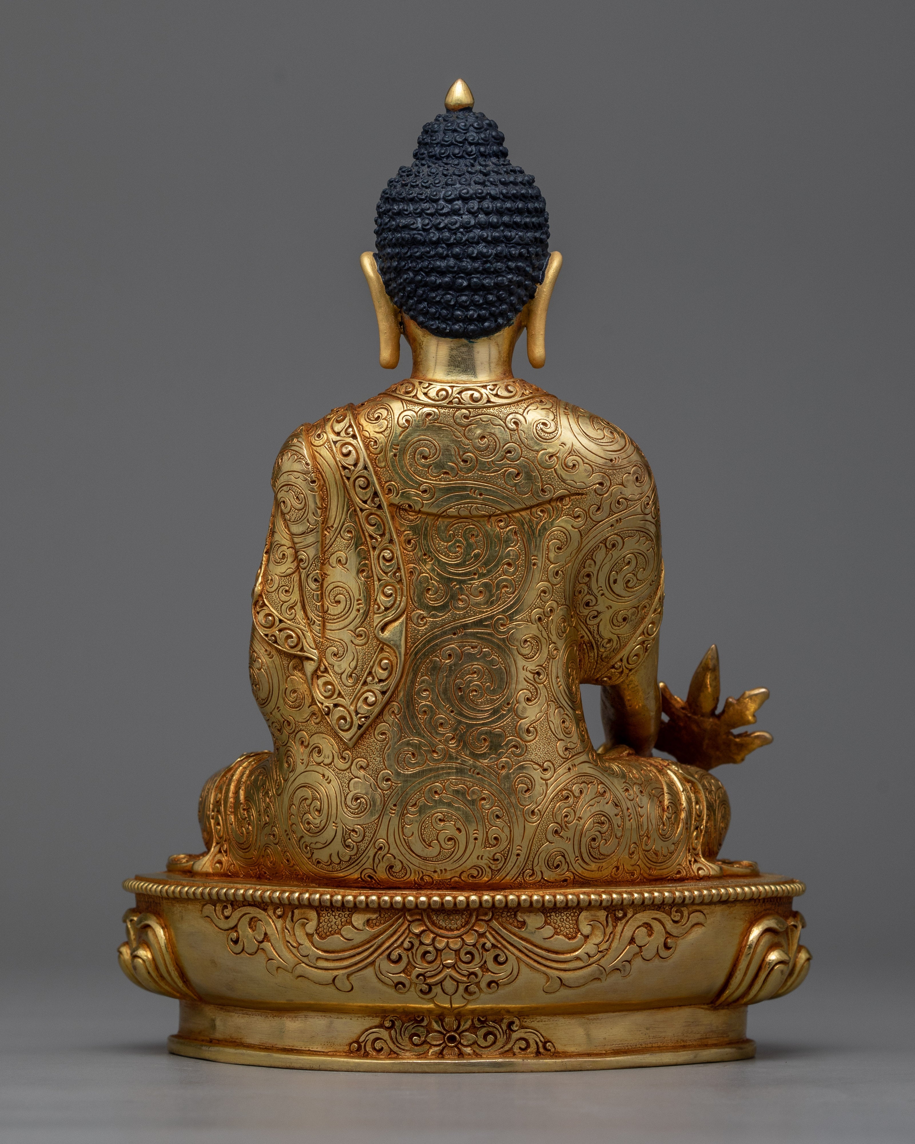 Experience the healing energy of our Medicine Buddha Sculpture, a Buddhist symbol of health and well-being. The rich 24K gold gilding on this finely made statue is a monument to the great craftsmanship of our Nepalese artisans. The mix of gold and acrylic paintings on a solid copper body not only gives a touch of elegance but also conveys the Medicine Buddha's deep spiritual meaning.