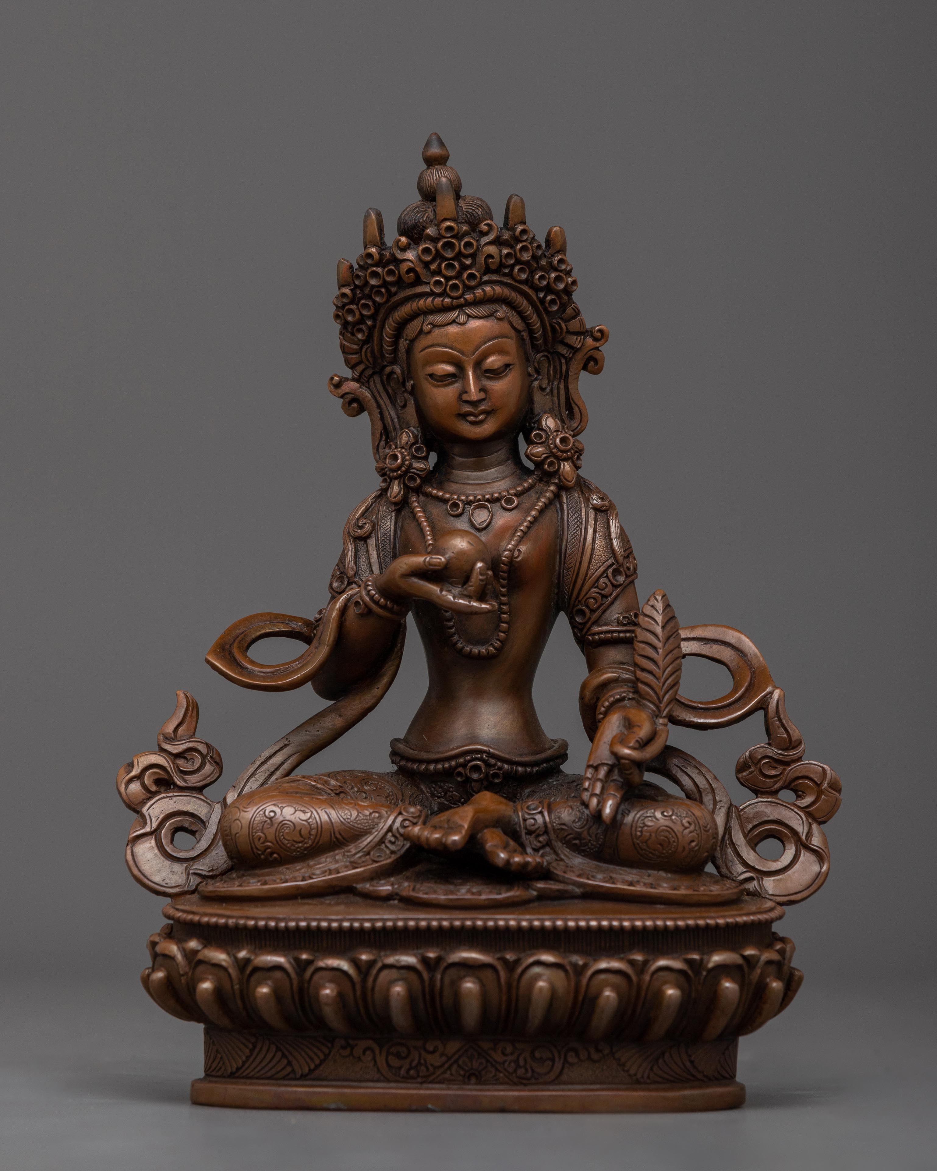 The Bodhisattva wears an elaborate crown, symbolizing spiritual authority and enlightenment. Jewelry and adornments signify her divine status and transcendence of worldly attachments. And is seated on a lotus pedestal, symbolizing purity and detachment from the material world. A serene and compassionate expression reflects the Bodhisattva's enlightened state and boundless compassion.