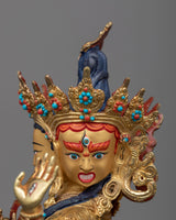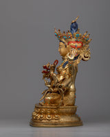 This lovely artwork was made by our skilled craftsmen in Nepal with all of their hearts. Each delicate design on the statue's copper body was carefully carved and covered in 24K gold leaf. Namgyalma's expressive facial features are enhanced with acrylic paints, which give the statue a sense of serenity and divine elegance.