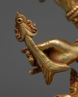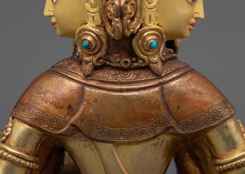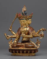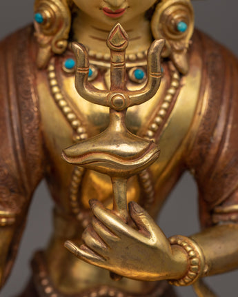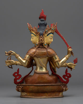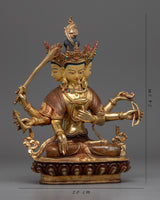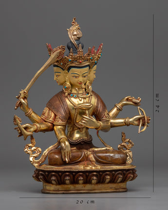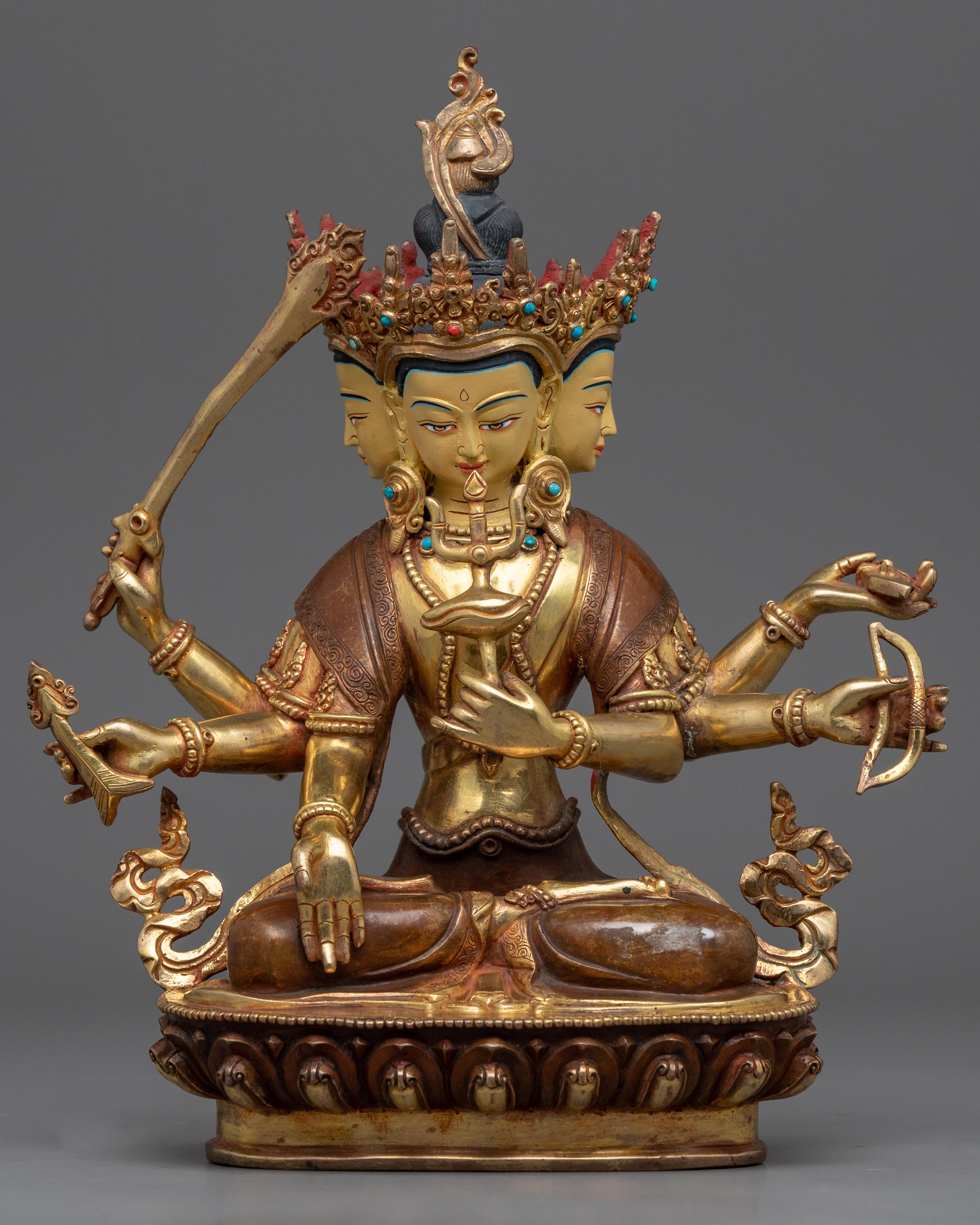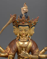Carved out of copper, this statue of Kadampa Manjushri was gilded in genuine 24K gold for the sheen and highlighted with acrylic colors. Crafted with the utmost care and precision, this statue boasts intricate details and a rich, golden finish. In the statue, the bodhisattva of wisdom is depicted with three faces and three pairs of arms. This depiction of multiple heads and arms represents his ability to skillfully handle various situations and tasks. Here, he holds a scroll, a bow, and a trident with his three right hands, while he wields a fiery sword, carries an arrow, and performs the 'Varada mudra,' a gesture of charity and offering with his three left hands.