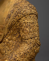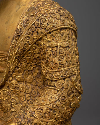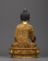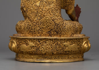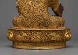 At 12.5 inches tall, our Kadampa Medicine Buddha Statue embodies peace and spiritual wisdom. Its strong base spans 8.2 inches and weighs a robust 3.25 kg, and it was handcrafted with care. The copper body of the statue gleams with a beautiful touch of 24k gold plating, lending it a magnificent aspect. Each curve, contour, and feature has been meticulously developed to provide a spiritually uplifting visual experience.