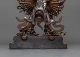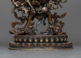 12 Armed Kalachakra (Yab-Yum) is very significant in tantra, and it symbolizes the union of great bliss and profound wisdom. This union represents the experience of enlightenment, the result of the tantric meditations is very complex. The statue was hand-carved by Nepali Artisians based in Kathmandu and gilded in pure 24k Gold in a copper body.