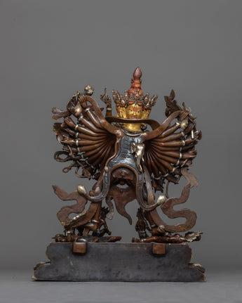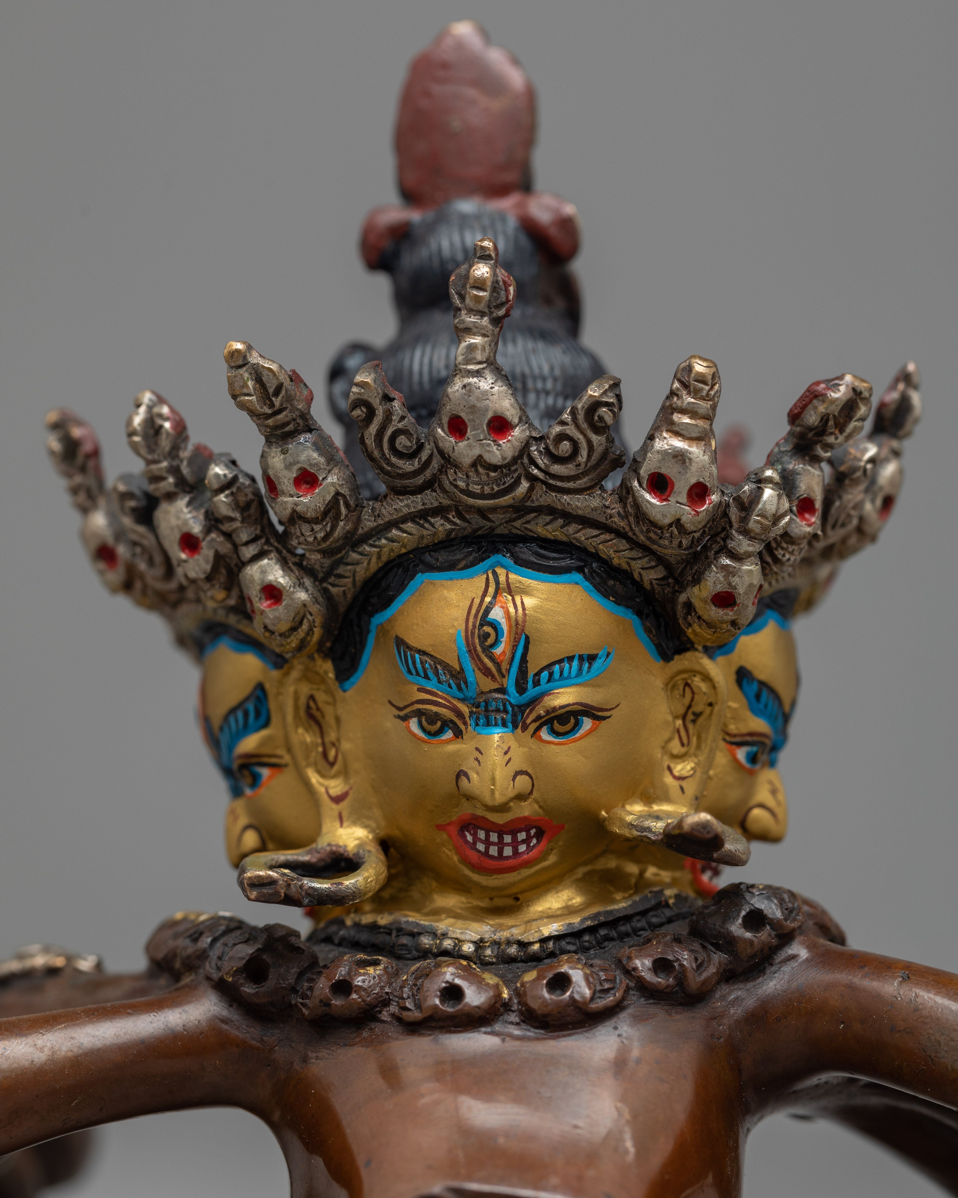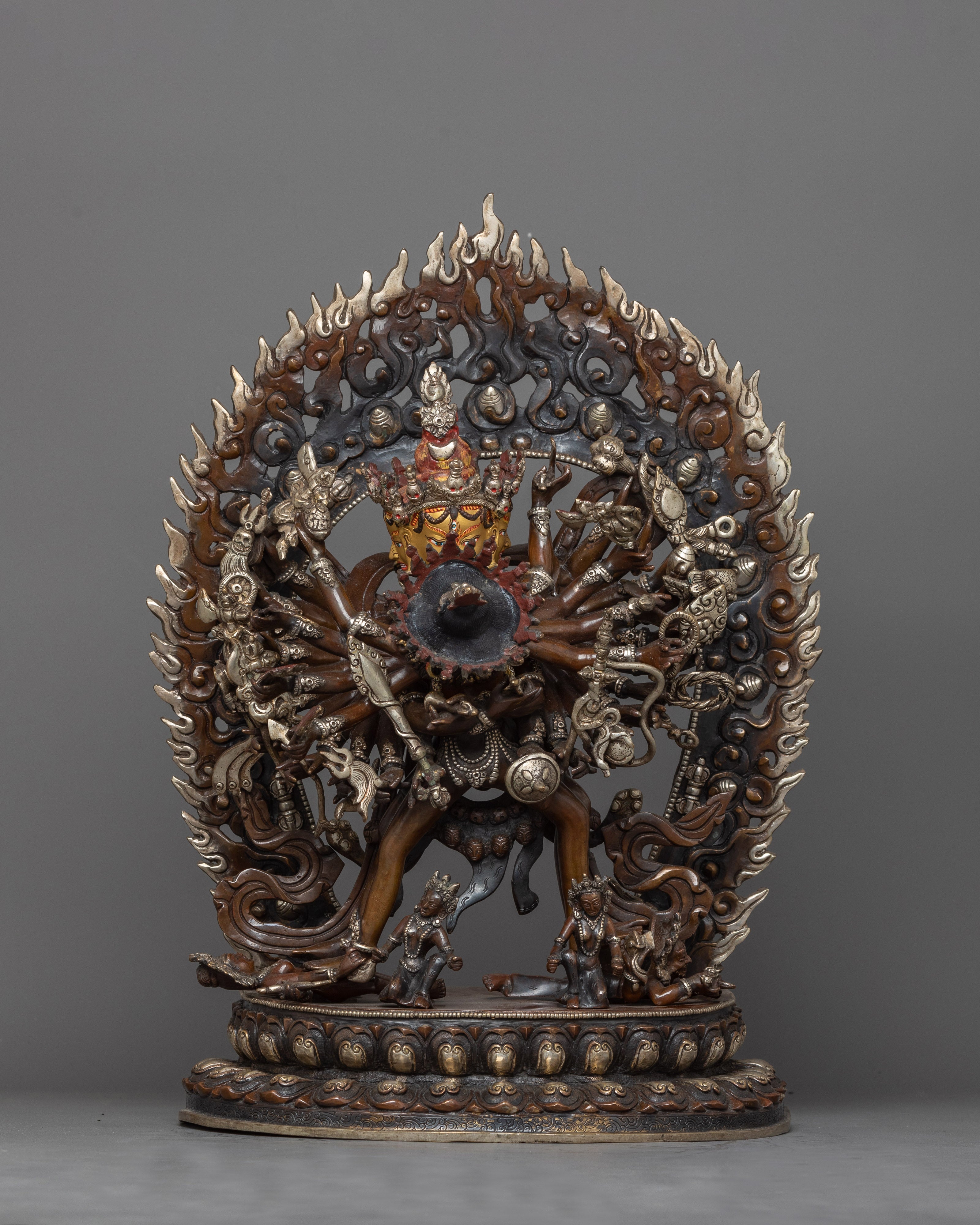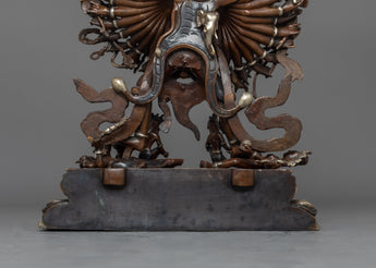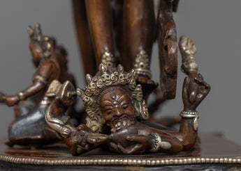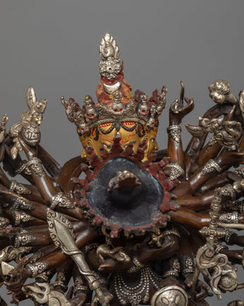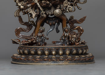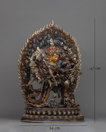 Immerse your holy area with the Kala Chakra Statue's beautiful spirit. This magnificent sculpture is 18.5" (47 cm) tall and weighs 11.16 kg. It was skillfully made using an oxidized copper body, silver plating, and acrylic and gold paintwork. The Kala Chakra, which stands for eternal knowledge and spiritual balance, extends an invitation to accept life's cyclical cycle and awaken to the deep mysteries of the cosmos. Accept its life-changing influence and set off on a path toward enlightenment and spiritual development.