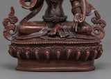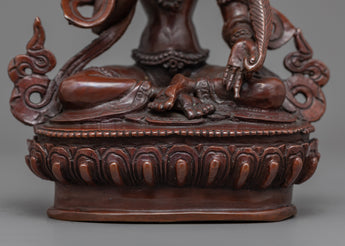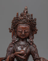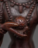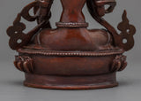 Master Sculptors from Kathmandu crafted this magnificent statue of the Ksitigarbha Buddha in our studio using traditional Himalayan art. The figure depicts the Ksitigarbha relaxing on a lotus seat while donning exquisitely carved jewelry. In his right hand, he carries a pearl with incredible magical powers. The Varada mudra, which denotes "gift offering," can be seen on his left hand. His headwear is lovely and formed like lotus petals with more stones. Oxidized copper was used to make the sculpture. All of the exquisite features of the god were hand-carved.