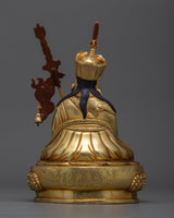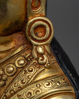 The Lake Born Vajra Guru Tsokye Dorje Statue powerfully portrays the divine essence of Guru Rinpoche, also known as Padmasambhava, in his Tsokye Dorje form. This 7.9" (20cm) tall statue, carved and gilded with 24K gold, exudes a powerful spiritual presence. This monument, a beautiful portrayal of the Guru's enlightened power and wisdom, serves as both a spiritual focus and a tribute to Himalayan workmanship and Buddhist tradition.