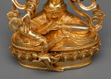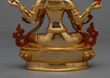 The statue is made of a copper body and then gilded in genuine 24k gold. She is depicted sitting atop a lotus with her right leg stretched and left leg drawn in. She has 4 arms, 1 face. She wears a beautifully hand-carved crown and silk garment flowing around her.