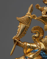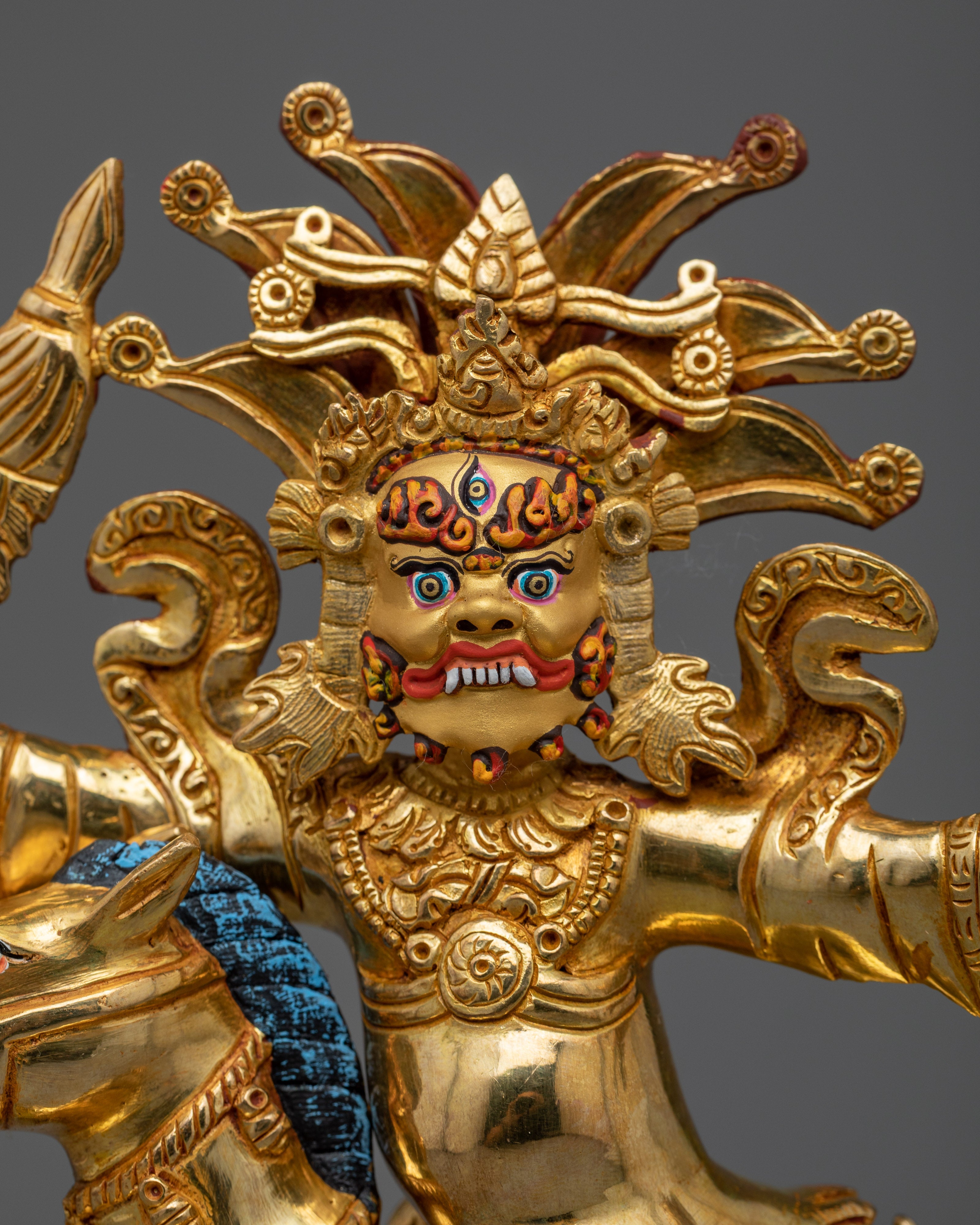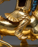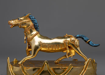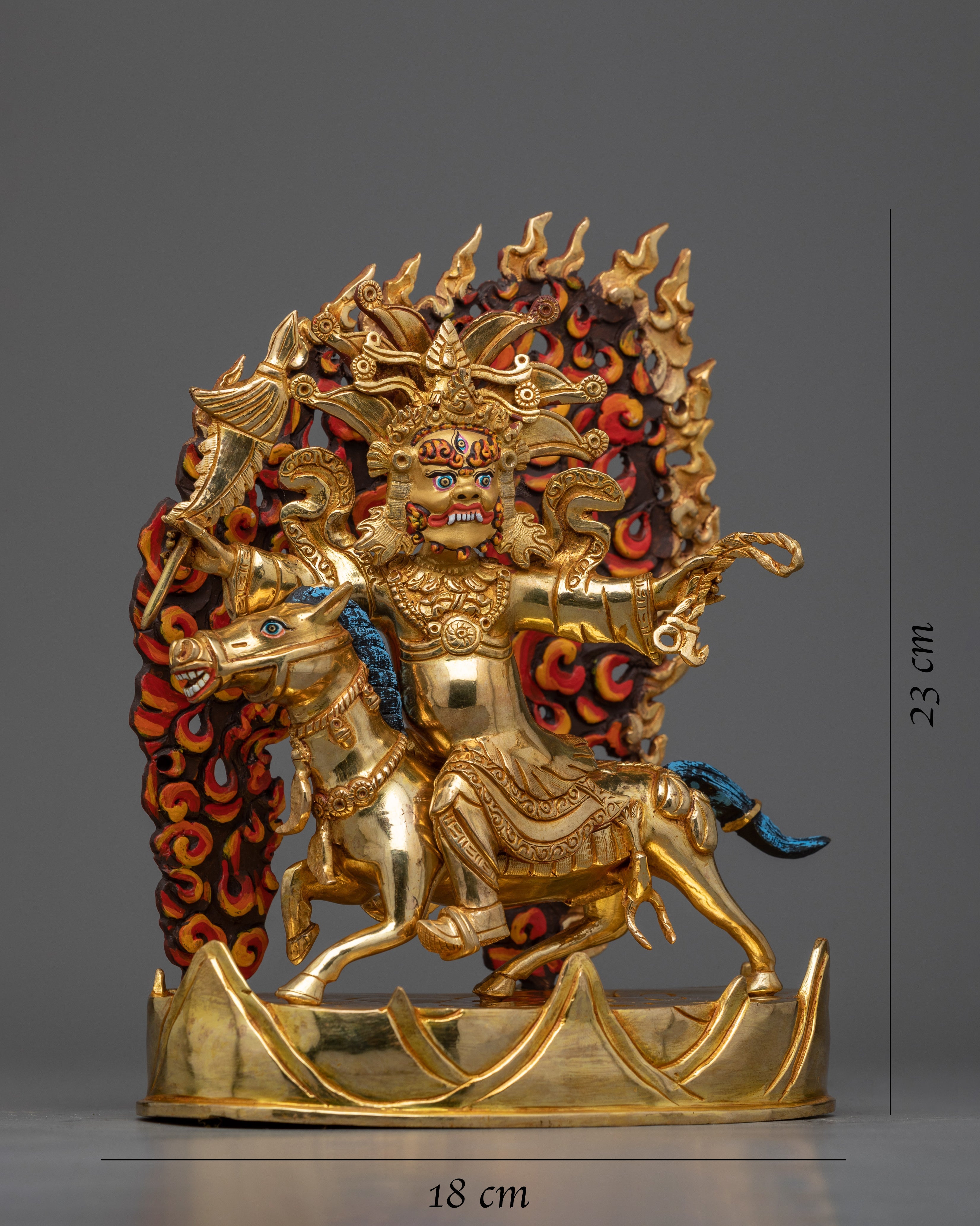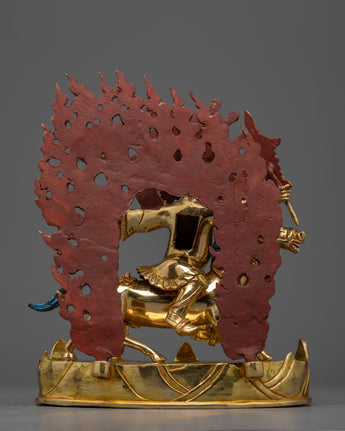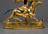 Our magnificent Ling Geshar statue welcomes you into a world where art meets spirituality. This work of art conveys the essence of spiritual enlightenment that Buddhism values, echoing stories of wisdom and compassion. It mixes rich 24k gold gilding and colorful acrylic paints over a sturdy copper body, guaranteeing not only an aesthetically appealing presence but also a conduit to spiritual elevation. It was created with a harmonious blend of traditional workmanship and modern talent.