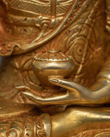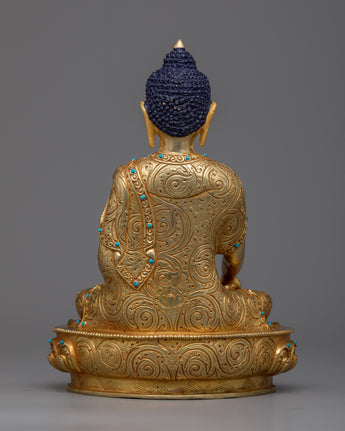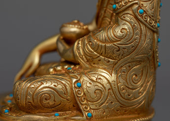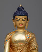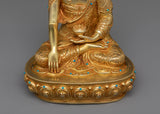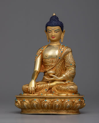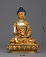 Find peace in this Shakyamuni Buddha statue, a symbol of knowledge and enlightenment. This exquisitely made statue, which is 8.2" tall with a 5.9" base, displays a wonderful portrayal of the cherished "Little Buddha Sculpture." Its solid copper construction, elaborate 24K gold plating, and superb acrylic paints are evidence of the unrivaled craftsmanship of Nepalese craftspeople. The Shakyamuni Buddha statue captures the essence of Buddhist teachings in every little detail, from the serene countenance to the exquisitely etched robes. The statue is the perfect addition to your meditation area or shrine because it not only improves your decor but also acts as a beacon of tranquility and inner calm.