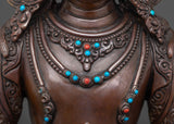 This magnificent Long Life Amitayus Deity statue is an artwork made of oxidized copper and embellished with hand-carved jewels. Amitayus rests in peaceful meditation, holding the vase of everlasting nectar, which represents endless life and healing. The statue's copper surface gives it a timeless appearance, and the gemstone decorations add to its beauty and spiritual importance.
