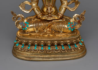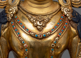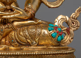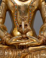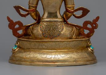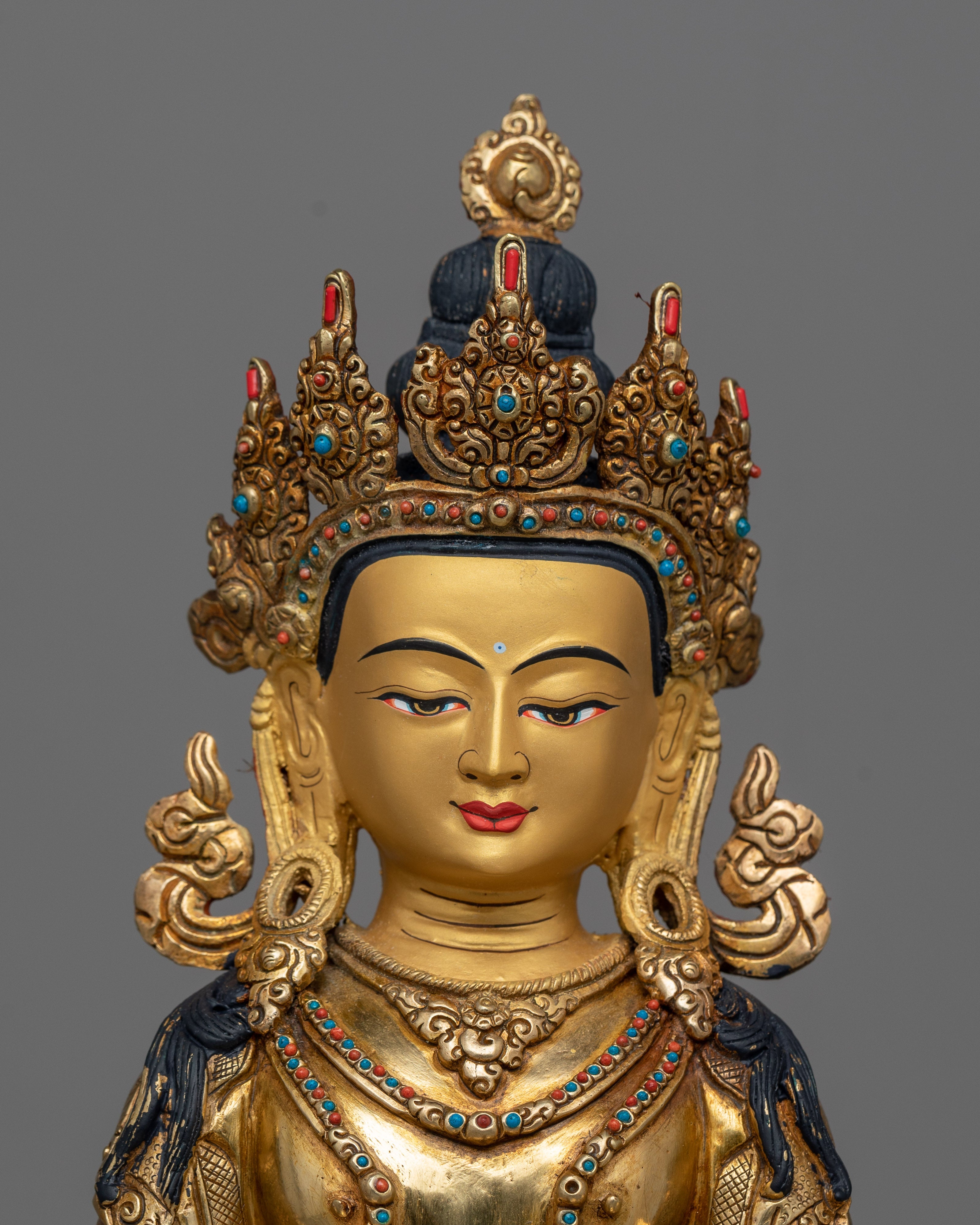Here is the Longevity Bodhisattva Amitayus Statue, a calm and potent depiction of Amitayus, the Buddha of Infinite Life, renowned for giving his followers longevity and knowledge. This statue, which is 13 inches in height and 9.4 inches in base and weighs 3.01 kg, is a tribute to the creativity and spiritual devotion that go into creating the likeness of Amitayus. It embodies Amitayus' luminous tranquility and infinite compassion. It is crafted from a copper body with 24K gold plating, embellished with gold and acrylic paintings, and accentuated with hand-carved jewels.