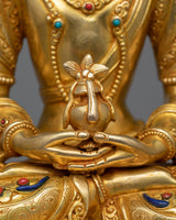 Here is the Longlife Deity Amitayus Statue, a calm and potent depiction of the Buddha of Infinite Life, Amitayus, renowned for bestowing longevity and knowledge on his followers. This statue, which stands 9.1 inches wide by 13 inches tall and weighs 3.31 kg, is a monument to the creativity and spiritual grace embodied in the form of Amitayus. Made from a copper body gilded in 24K gold, it is embellished with paintings in gold and acrylic, hand-carved jewels, and other embellishments that bring out the radiant serenity and infinite compassion of Amitayus.