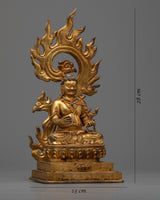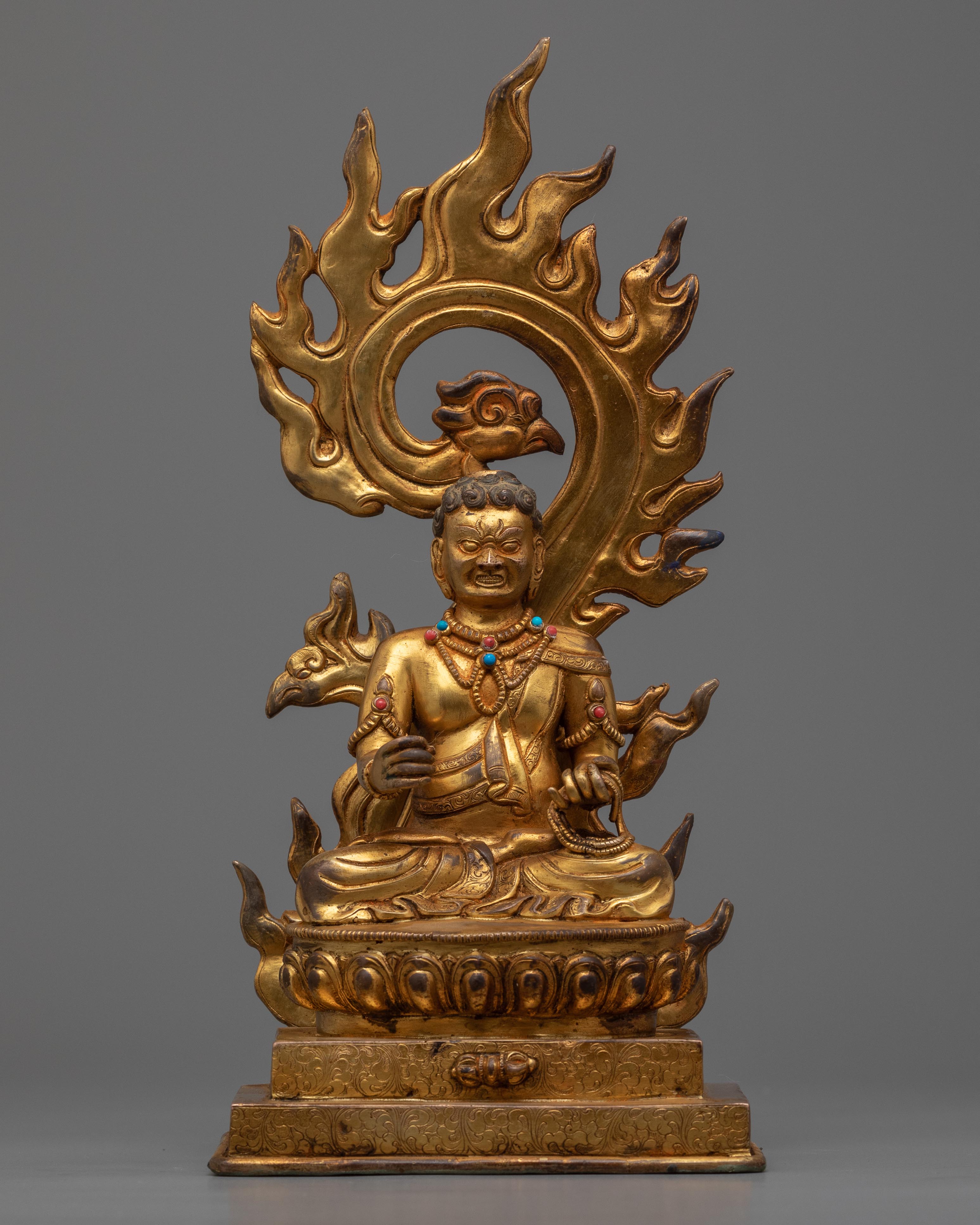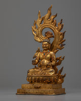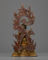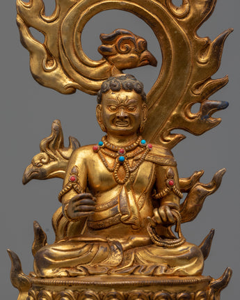 The figure of Lord Yamraj, the deity of death, is portrayed seated atop a moon disc lotus seat in this statue. The deity is depicted in his characteristic wrathful appearance sitting on a moon disc lotus seat as blazing fire surrounds him, representing death's transformative power, which is seen as a form of spiritual purification and rebirth. He is shown holding a noose or a lasso in his right hand, which he uses to capture and subdue demons and negative energies that threaten the practice of Buddhism.