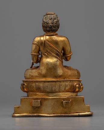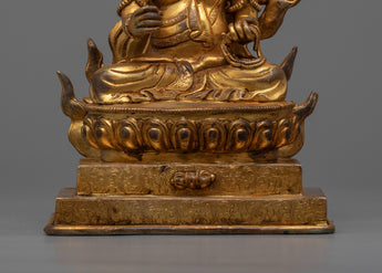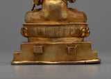 This statue was hand-carved out of copper, gilded in gold, and has an antique finish adding an element of antiquity. The ideal Buddhist shrine addition can be a meditative accompaniment for yourself or any devotee.