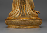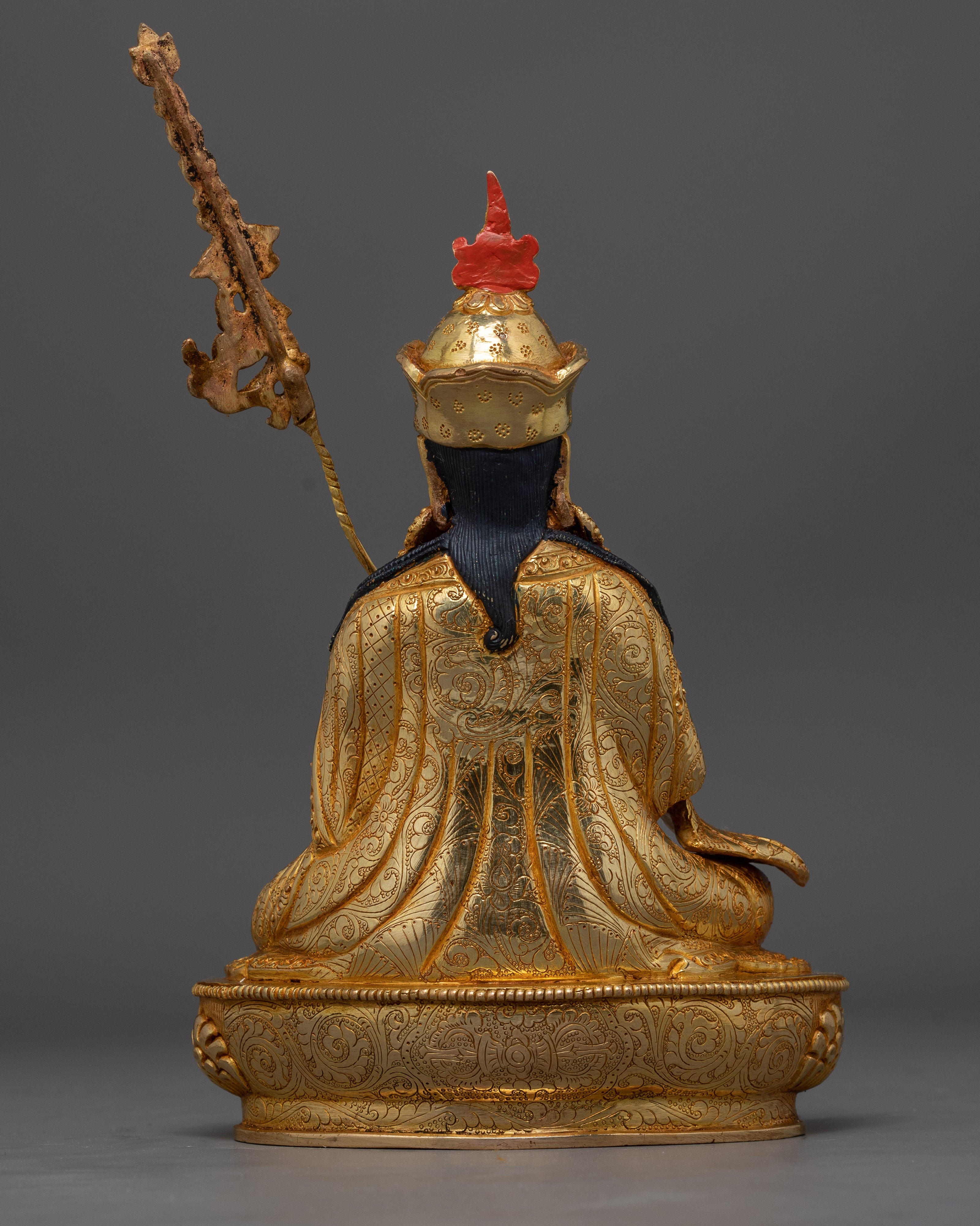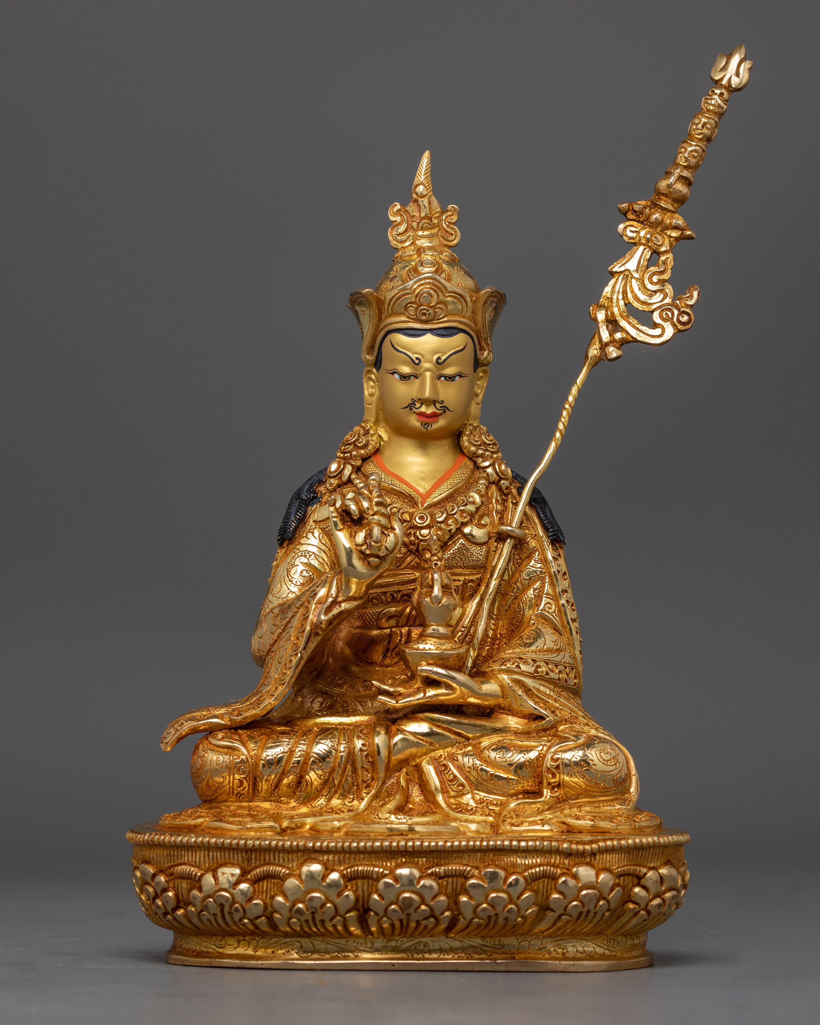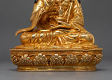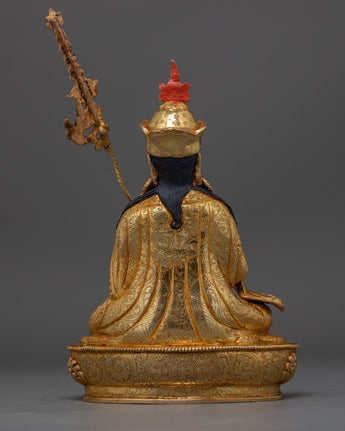 Experience the divine grace of the Lotus-Born Guru Rinpoche Sculpture, an enchanting representation of the revered Padmasambhava, the Tibetan Buddhist guru. This sculpture honors the enlightened teachings and miraculous birth of the Tibetan Buddhist founder, Guru Rinpoche, whose presence is associated with the transformational force of the Dharma. Measuring a tranquil 9.8 inches, this magnificent sculpture showcases the unmatched craftsmanship of Nepalese artisans. It is painstakingly carved from a copper body and lavishly covered with 24K gold gilding on the surface.