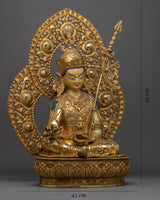 We have hand-carved the statue of Guru Rinpoche in the traditional Himalayan Art of Nepal. Skills passed to us by generations of ancient sculpting artists adhering to their proper iconographic form. Hand carved from a copper body, gilded with 24k genuine gold and finely painted with acrylic colors, which highlight the intricate design of the patterns. The Guru Rinpoche statue depicts the deity seated on a lotus seat and adopting a semi-angry stance. The deity holds a vajra with his right hand over his lap while he holds a skull bowl with his left hand, with a tantric staff resting over his shoulder. The statue of the Guru Rinpoche took our artists months of hard work with the intricate design patterns on the statue.