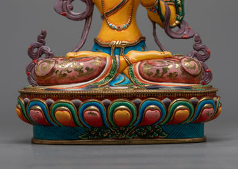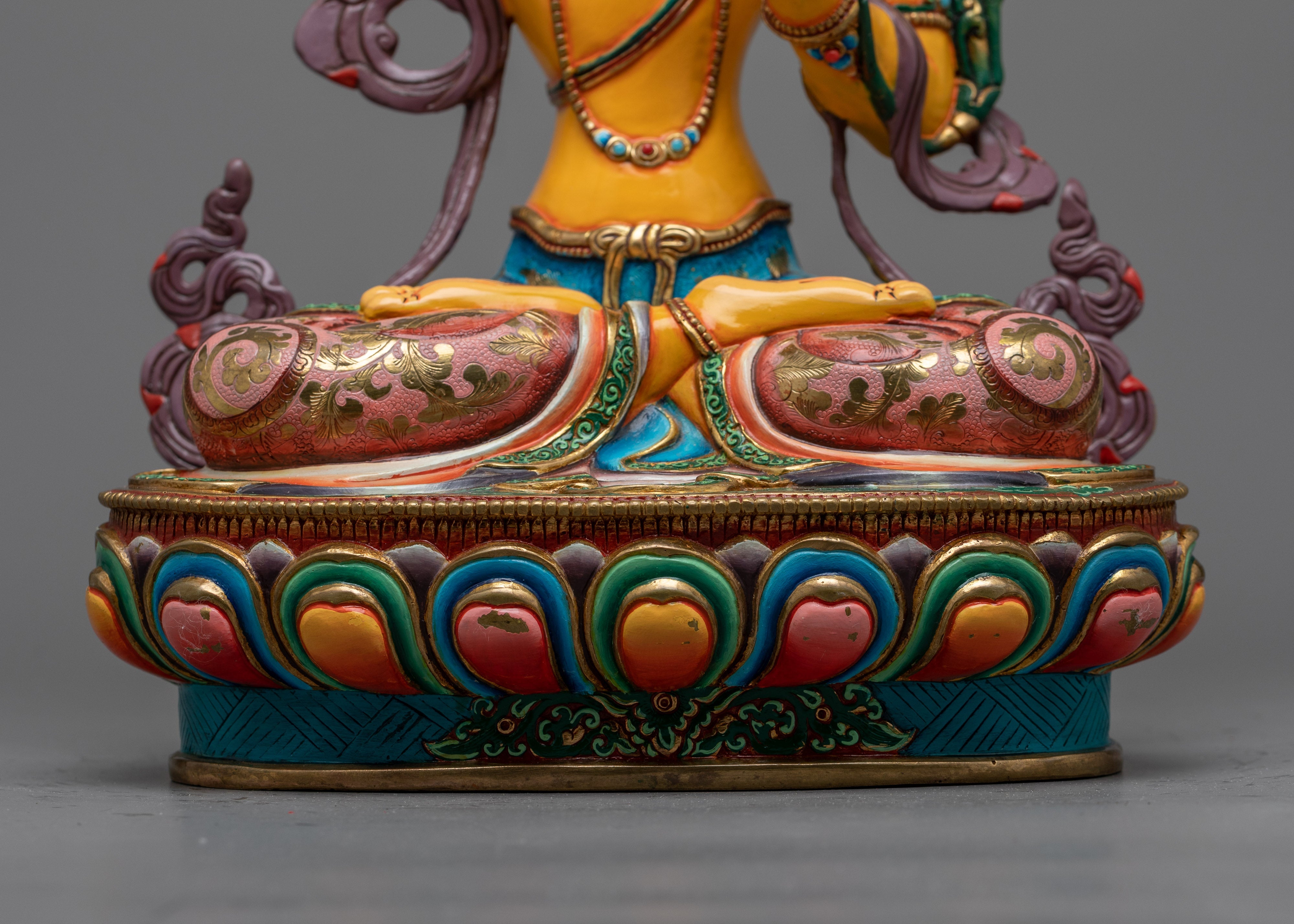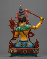 This statue is embellished with 24K gold gilding and is made of a copper body, which is known for its durability and traditional significance in religious art. This extravagant use of gold not only highlights Manjushri's holy essence but also gives the sculpture an unmatched brilliance. The elaborate acrylic and gold paintings complement the gold gilding, which draws attention to Manjushri's calm countenance, the beautiful intricacies of his clothing, and the lotus flower that holds up the holy text.