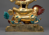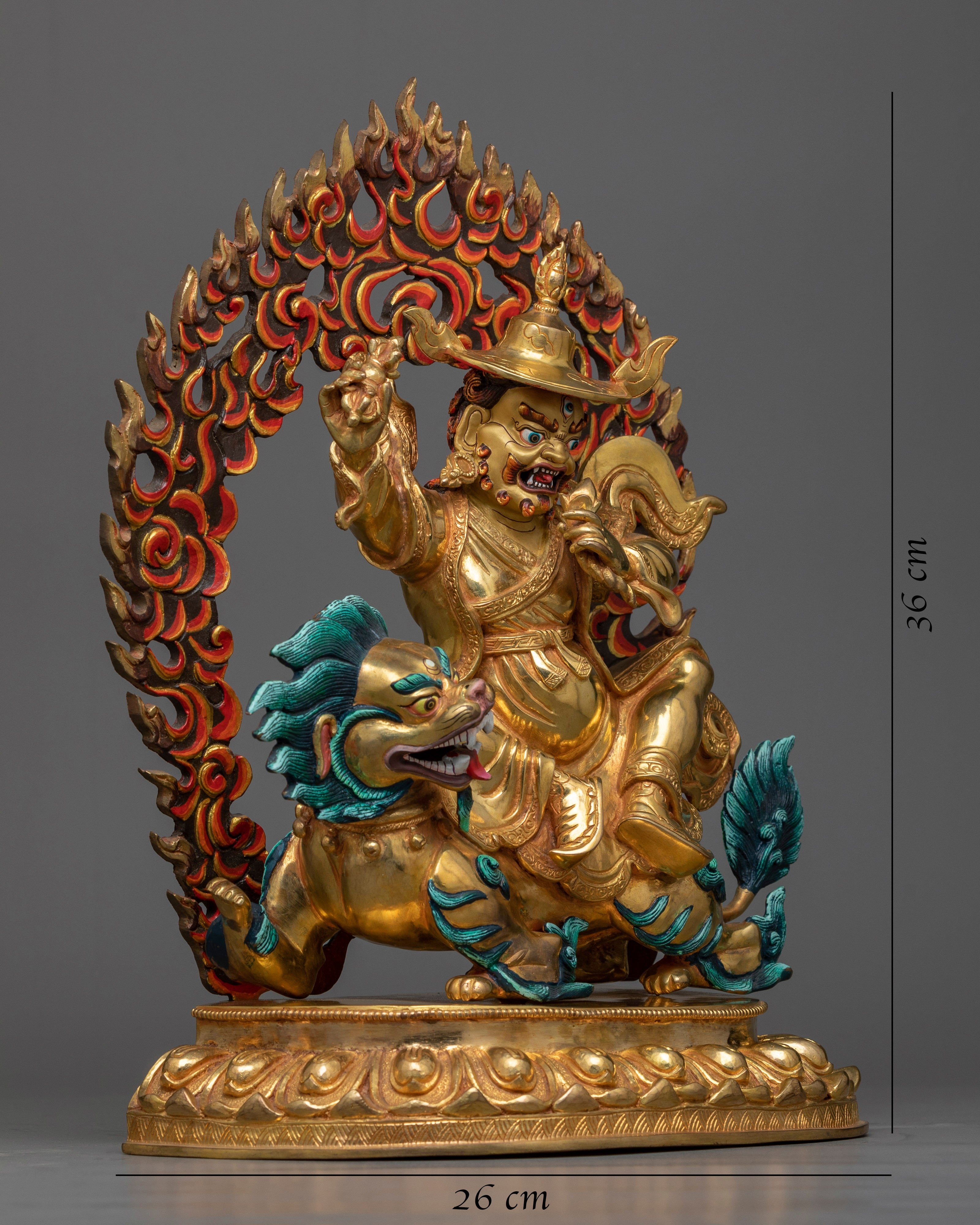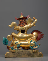 The robust copper body of this precisely handmade statue is adorned with luxurious 24K gold plating. Dorje Legpa's wrathful visage, traditional armor, and symbolic qualities are highlighted in gold and acrylic paintings. The presence of the statue is both uplifting and impressive, acting as a reminder of the protective power reflected in Buddhist teachings.