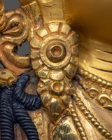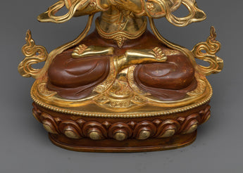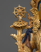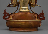 He is depicted sitting on a moon disc of a lotus seat with a calm expression. He holds a small flask he holds in his left hand, filled with a liquid of immortality. The Statue is made of copper and gilded in genuine 24k gold.