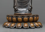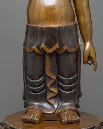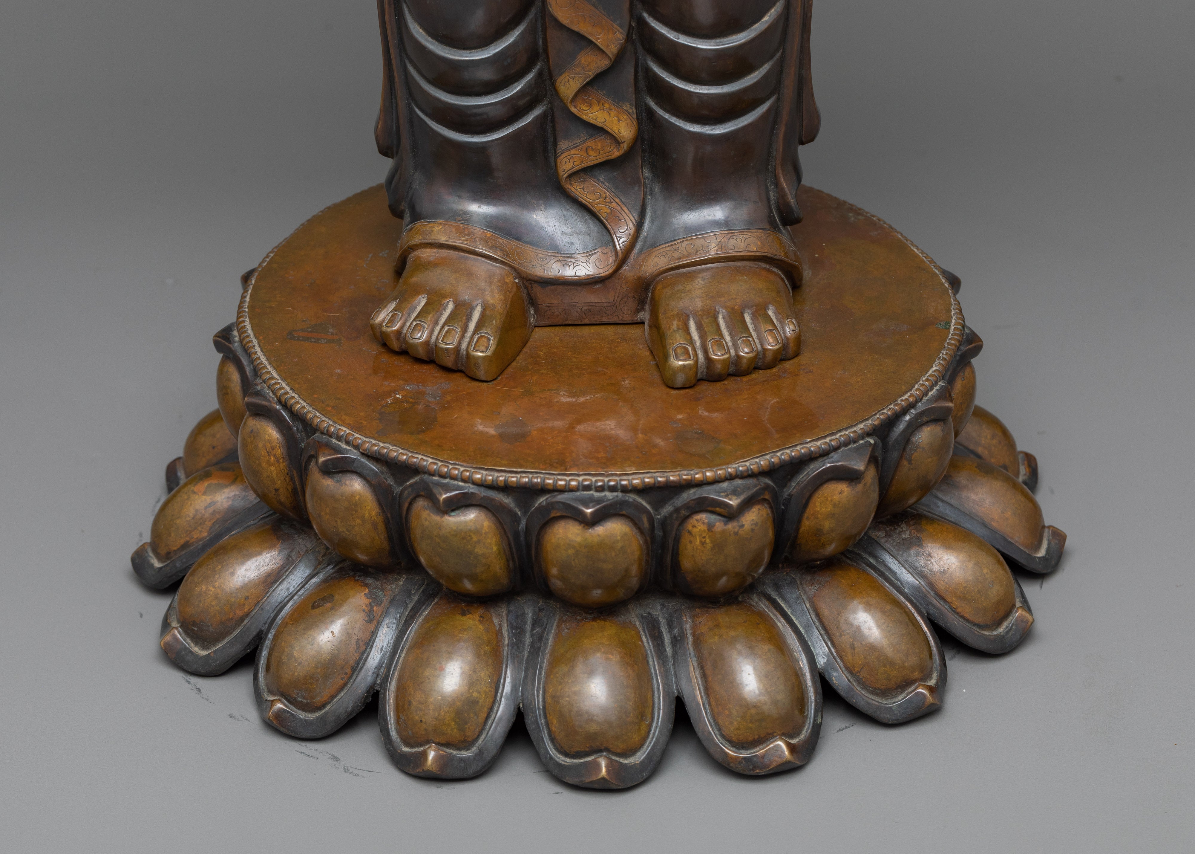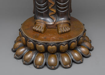 This statue's oxidized copper body is meticulously crafted, resulting in a rich, antique finish emphasizing its peaceful presence. The Buddha stands atop a double-petal lotus flower foundation, symbolizing purity and spiritual awakening. This statue is not just a piece of art; it's a profound representation of the path to enlightenment. It is perfect for a special place in your home or meditation space or as a centerpiece in a collection of spiritual artifacts.