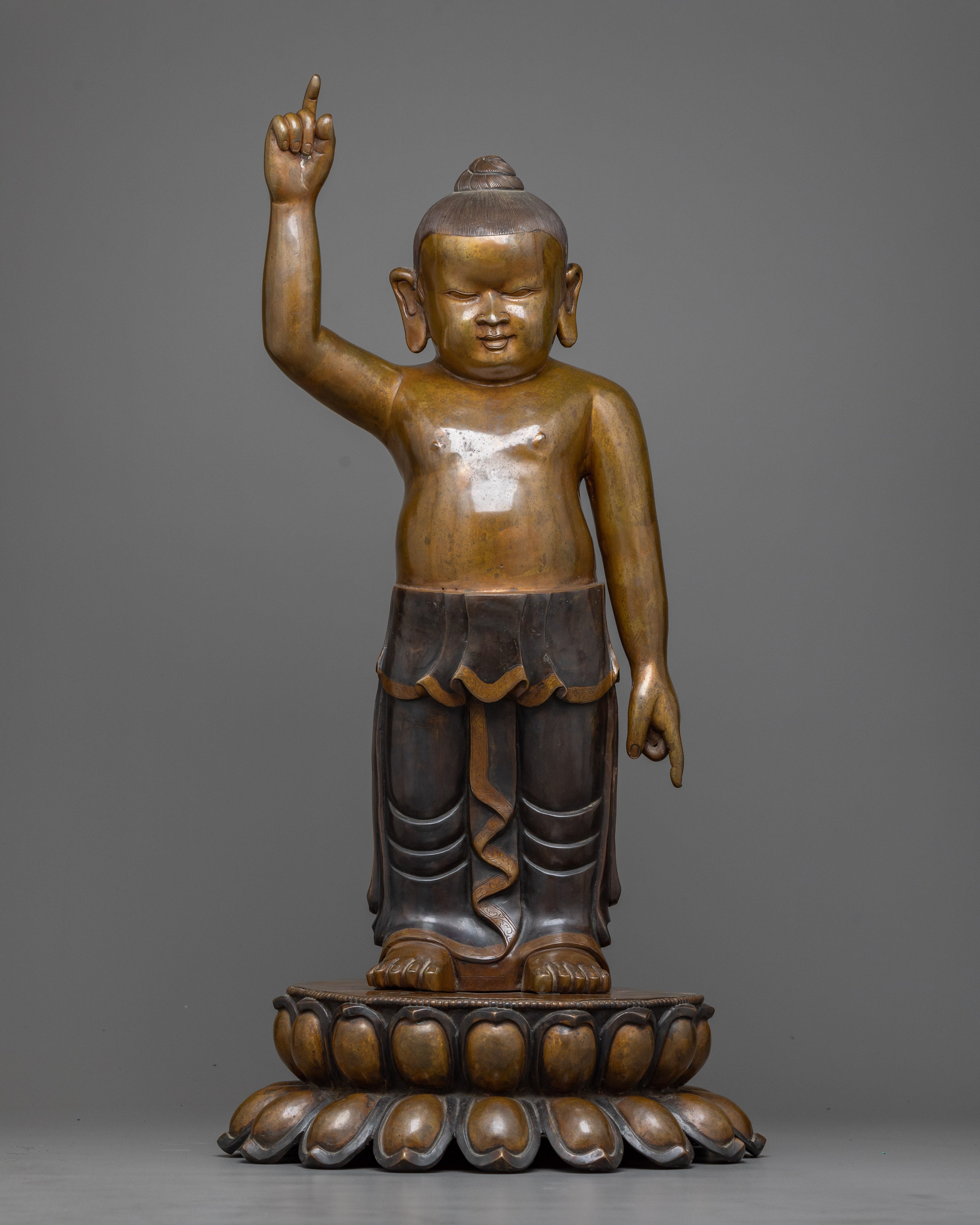 Introducing our Little Buddha Statue, a stunning sculpture that infuses your area with the energy of spiritual peace. This big statue, made of high-quality oxidized copper, stands boldly at over two feet tall and depicts the Buddha in a dynamic position, with his right hand pointing to the sky and his left hand pointing to the earth. This tremendous motion represents the Buddha's enlightenment moment, combining the spiritual and the terrestrial.