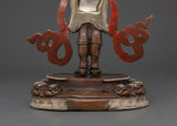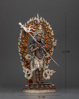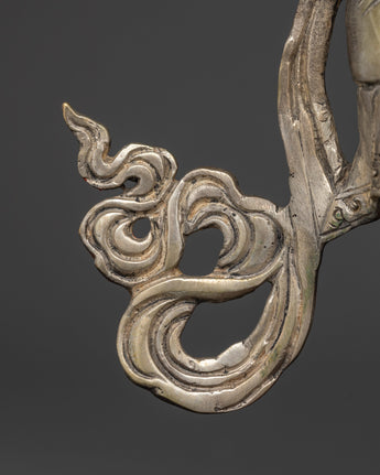 The finely carved Mandarava Handmade Oxidized Statue is 27 cm tall and constructed of quality oxidized copper. This statue's elaborate silver coating adds to its aesthetic and spiritual appeal. Any area is made feel peaceful and devoted by the tranquil expression of Mandarava, which was painted with great care and creativity. Her robes' elaborate designs and the lotus base she stands upon are highlighted by fine carvings.