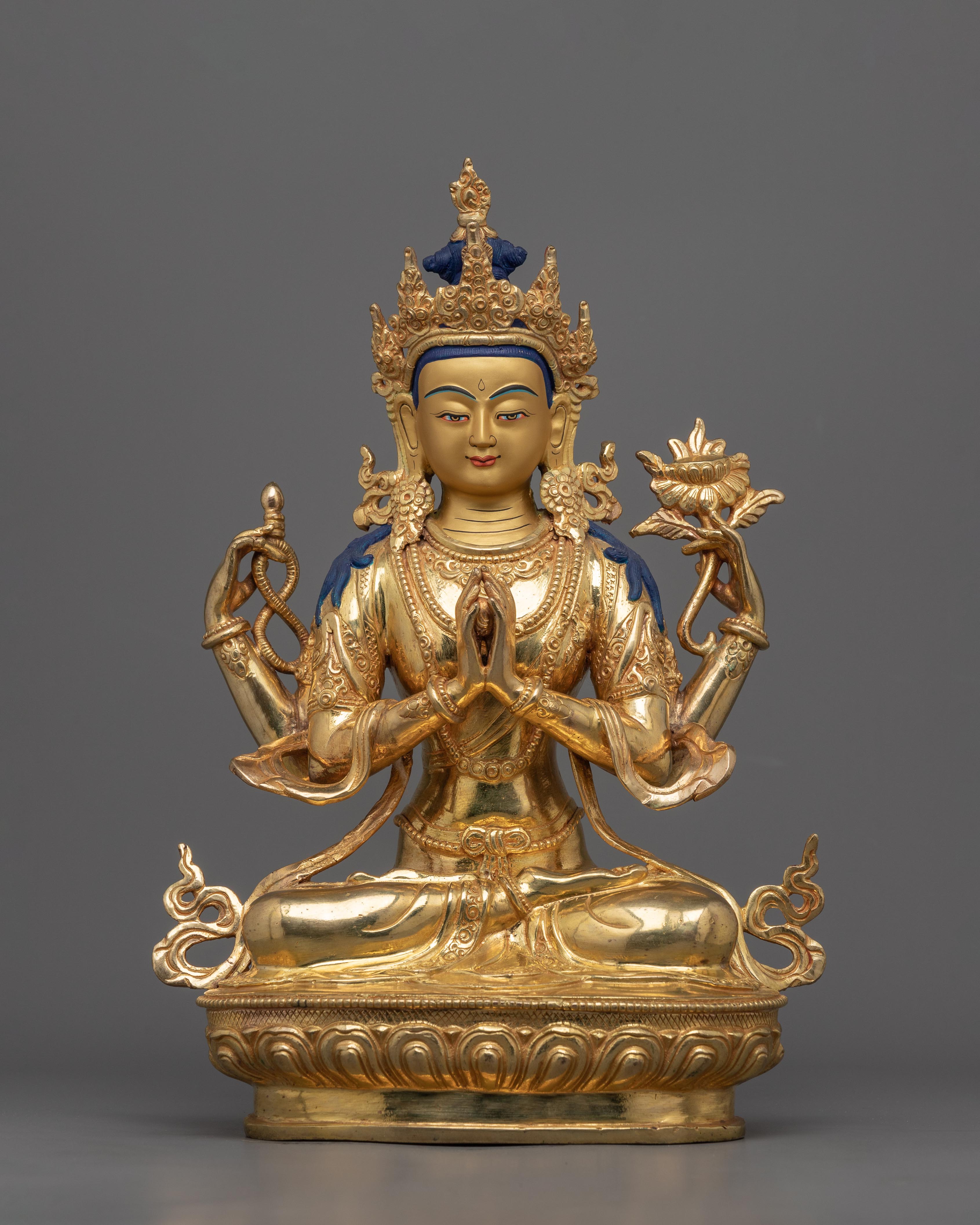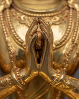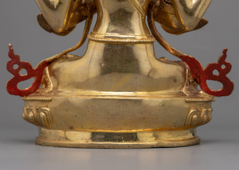 The Manjushree God Statue welcomes the embodiment of infinite wisdom into your sanctuary. This one-of-a-kind statue, adorned with fine 24k gold gilding and delicate acrylic paintings, exudes a sense of tranquility and enlightened understanding. The delicately made copper body emits an exquisite radiance, capturing Manjushree's holy spirit and seamlessly blending into any environment it adorns. Each detail of this statue, painstakingly sculpted by expert artisans, tells a story of peace, allowing you to explore deeper levels of spirituality.