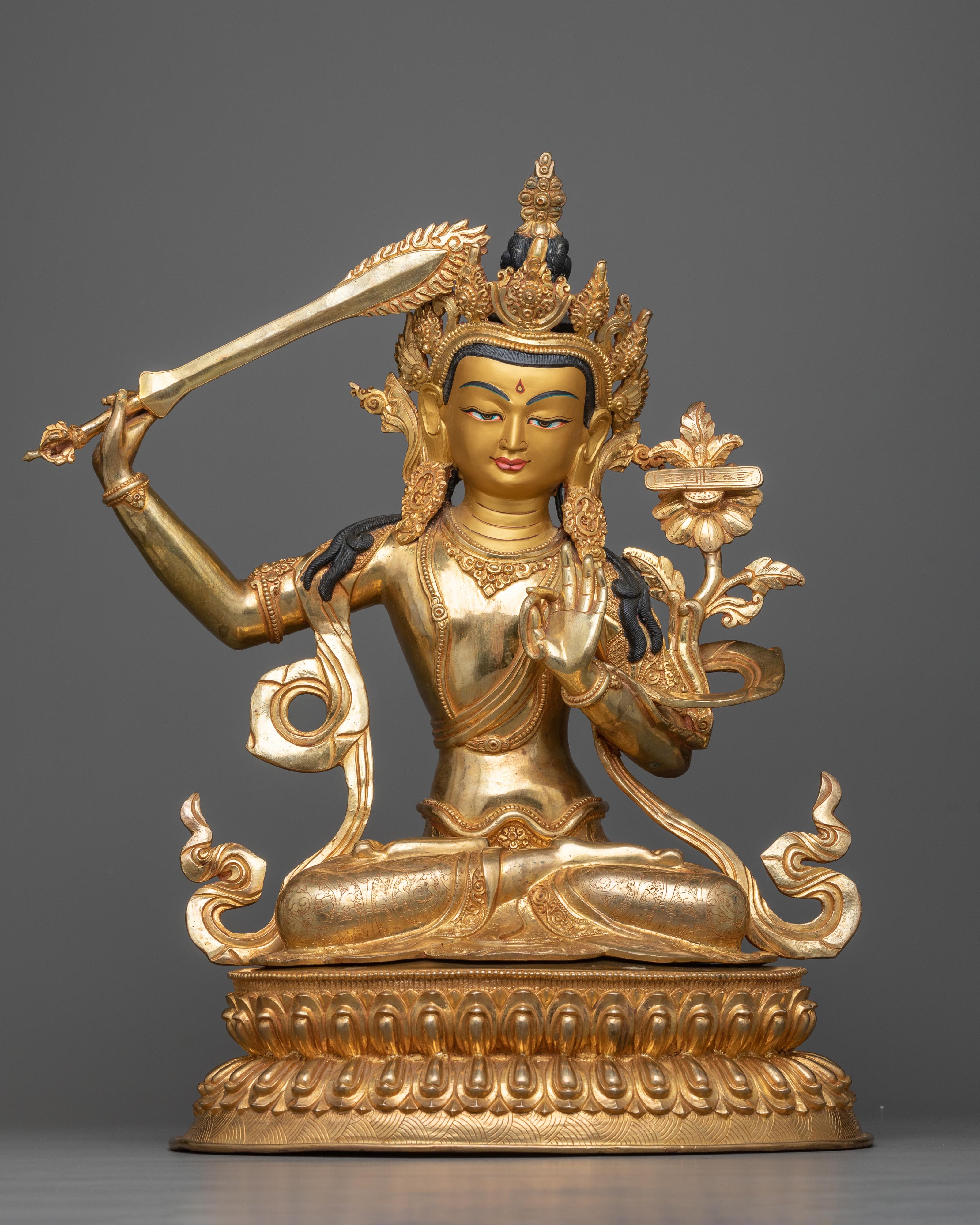 The wisdom deity is represented seated atop a double lotus seat, his right hand holding a blazing wisdom sword and his left hand holding a lotus flower on which the Prajnaparamita (Great knowledge) Sutra is resting.