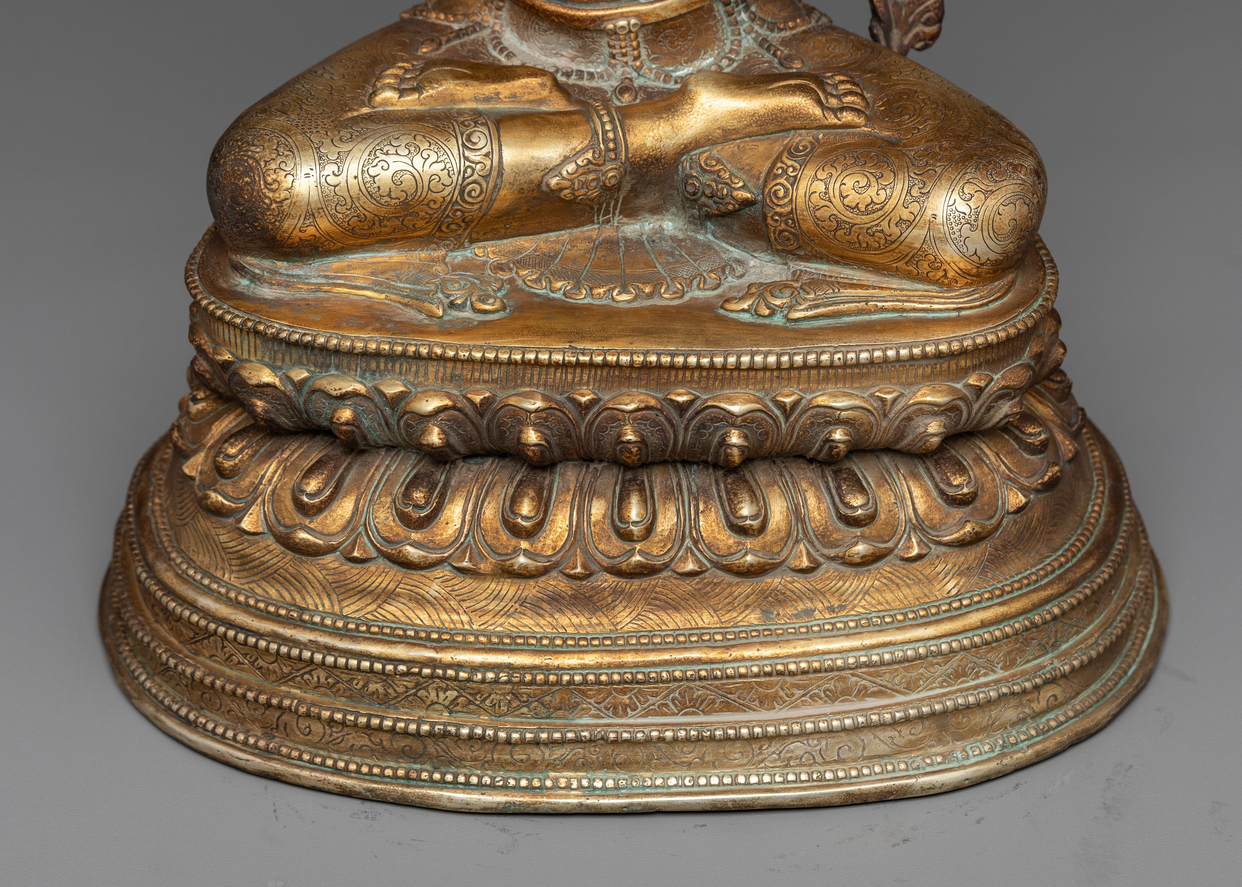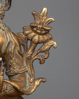 This statue is made of copper and is gilded in 24K gold with an antique finish to give it a timeless and venerable appearance. The antique finish not only gives character to the statue, but it also draws attention to the delicate details of Manjushri's features, such as his sword of knowledge and the sacred scripture he holds. The gold gilding lends a sense of devotion and solemnity to the statue, highlighting its presence in any area.