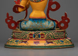 The Manjushri Bodhisattva Colored Sculpture is a brilliant image of the bodhisattva of transcendent wisdom in Mahayana Buddhism. Standing 15.3 inches tall and weighing 6.79 kg, this beautiful artwork blends the spiritual significance of Manjushri with amazing artistry. Crafted from a copper body, covered with 24K gold plating, and enhanced by gold and acrylic paintings, this sculpture is distinguished by a yellowish-orange hue that was precisely painted to depict Manjushri's body color, reflecting the light of wisdom that he possesses.