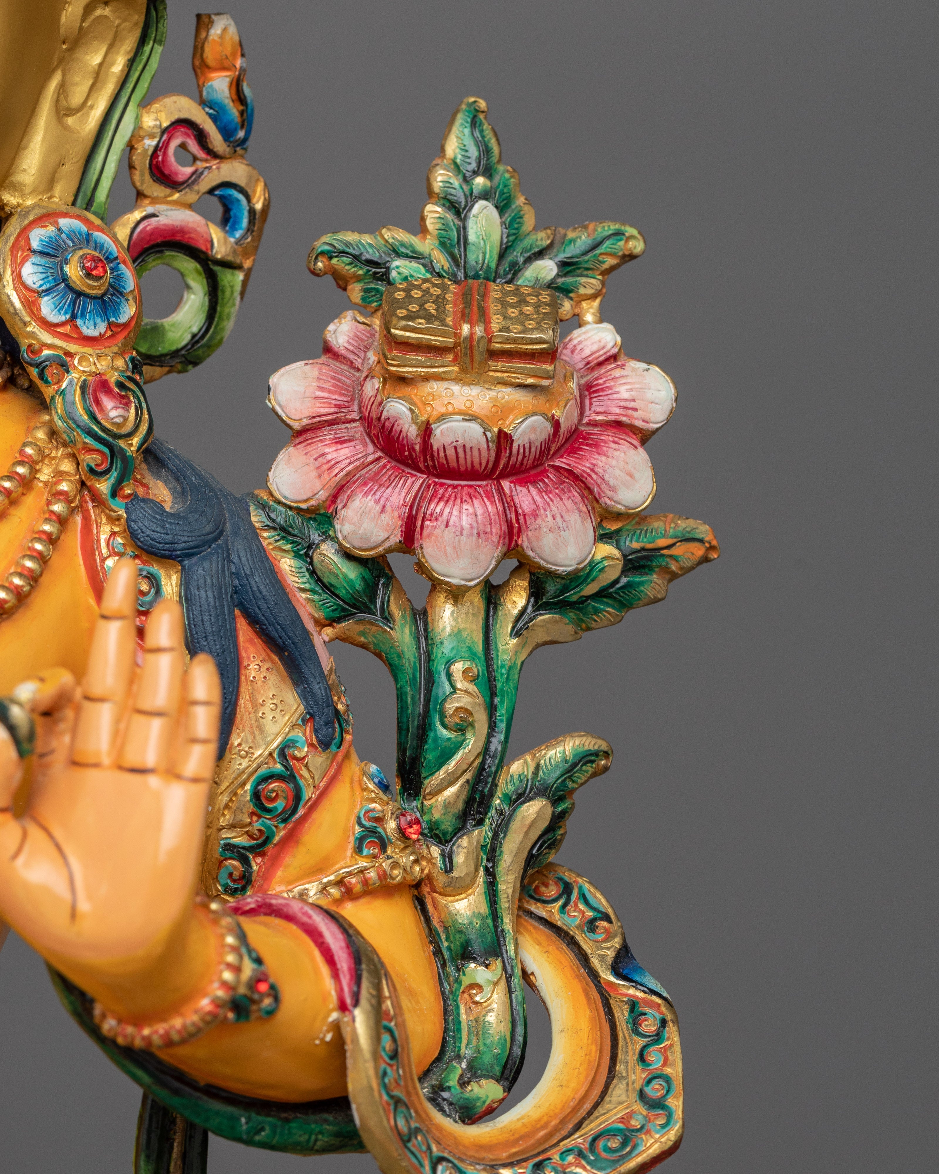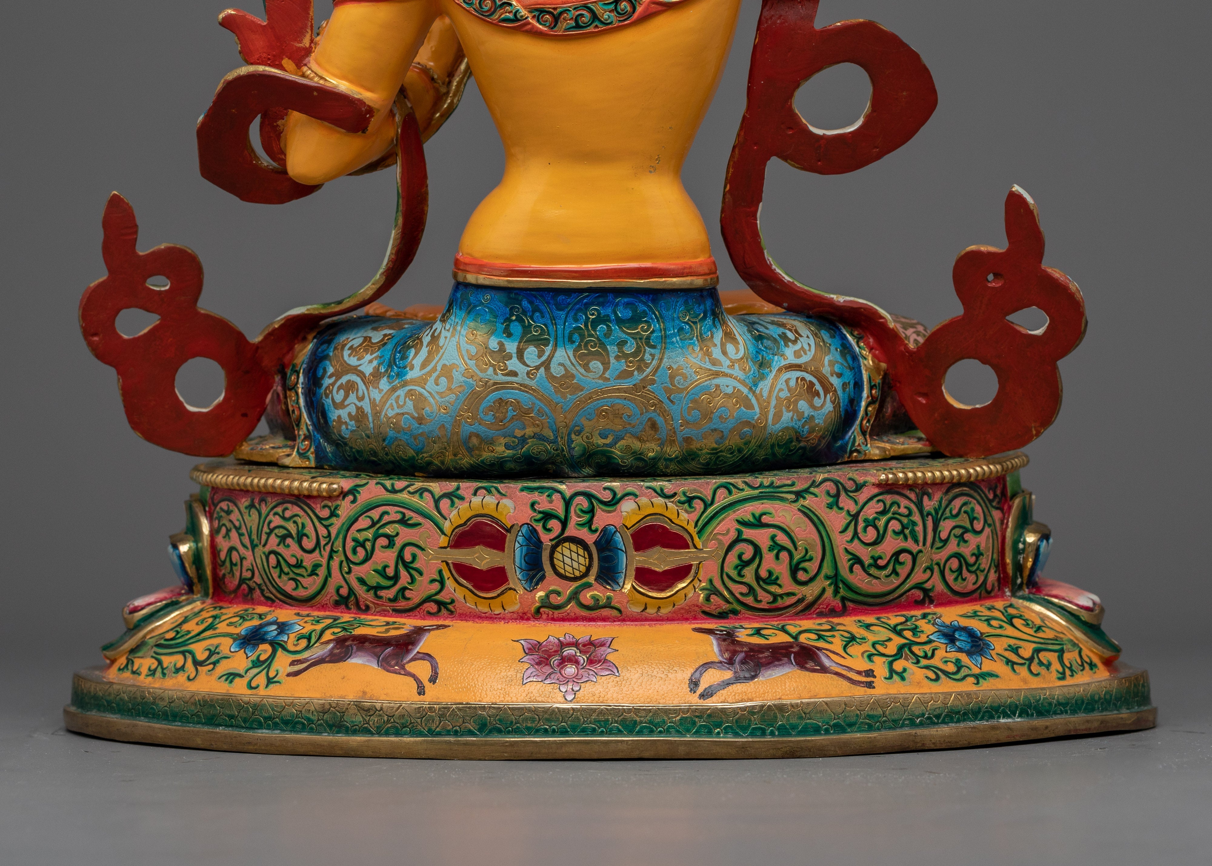 The statue depicts Manjushri in a dynamic pose, wielding the blazing sword that cuts through ignorance and delusion and clutching the lotus of the Prajnaparamita sutra, which represents the ultimate realization of emptiness. The vibrant colors, detailed iconography, and serene expression capture the essence of Manjushri's teachings on wisdom and compassion, making this sculpture a profound addition to any meditation space, altar, or collection of sacred art.