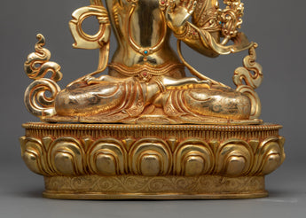 The Wisdom Manjushri Bodhisattva Deity Statue with complete iconographic detail as per ancient scripture sources was crafted in our studio in Nepal. Carved from a copper body, gilded with 24k genuine gold over the body and finely painted with acrylic paint, which further highlights the intricate design patterns of the sculpture. Seated upon a moon disc lotus with a peaceful expression, the deity is depicted holding a blazing sword and the lotus that holds the book of Knowledge. The deity is decorated with numerous precious jewel stones over the body and crown. The artists of Nepal worked tirelessly for many months to make this piece of Buddhist art.