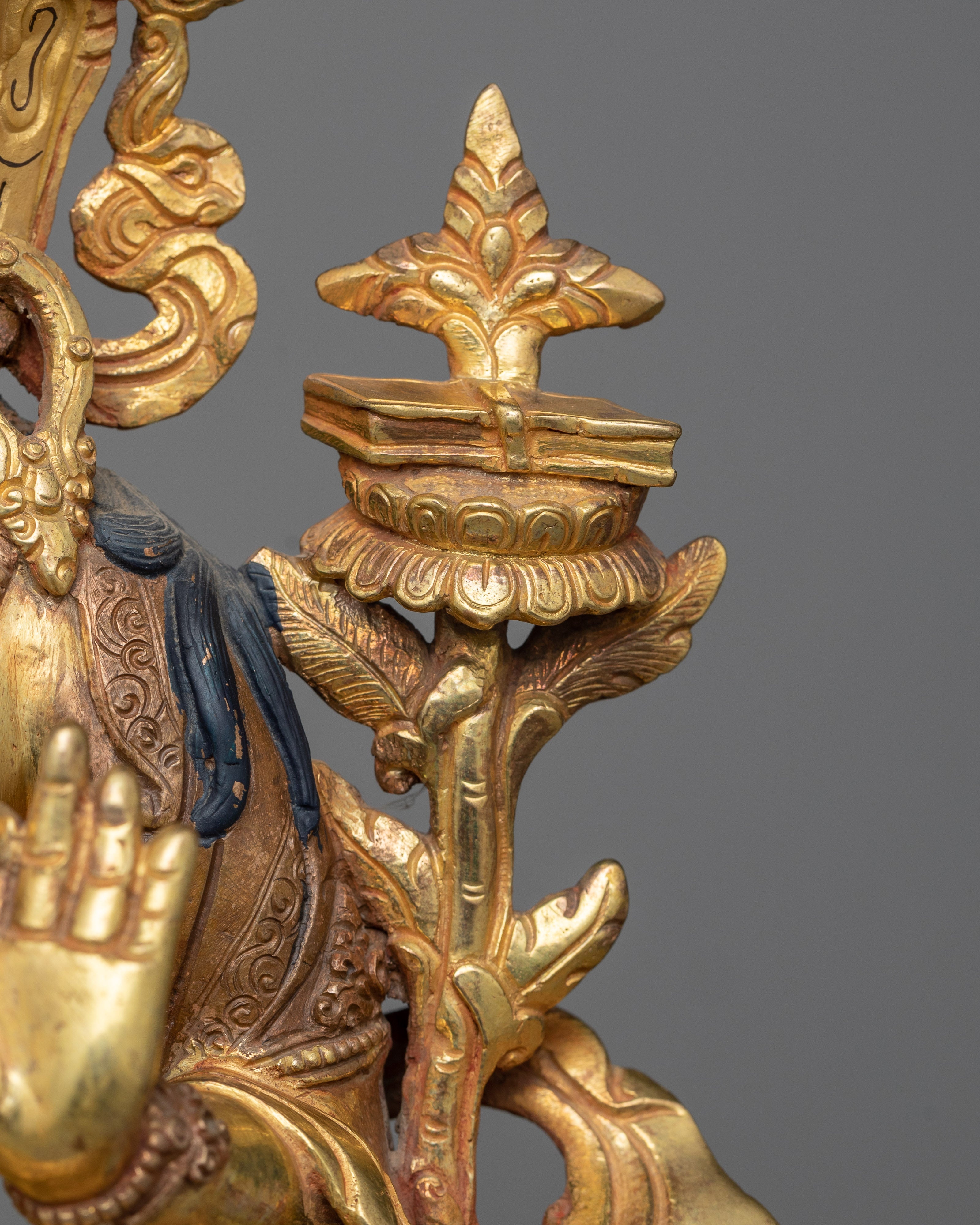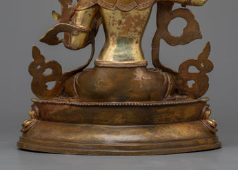 With our Manjushri Bodhisattva of Wisdom sculpture, the quintessential representation of enlightened intelligence, enter the realm of transcendent wisdom. The statue embodies the essence of this beloved bodhisattva with its copper foundation, while the flawless 24K gold gilding adds an ethereal shine. Manjushri's mission to eradicate ignorance is shown in the gold and acrylic paintings, which repeat stories from ancient scriptures. Aside from its obvious beauty, this sculpture speaks to the heart of Buddhist teachings, encouraging reflection and the search for genuine knowledge.