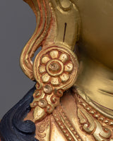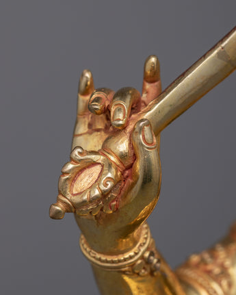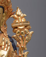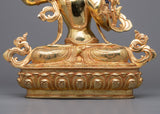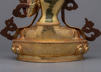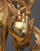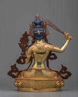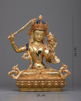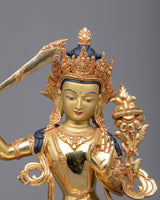 The 24K gold gilding, copper body, and acrylic paints used to create the Manjushri Buddha Bodhisattva statue give it an attractive appearance and guarantee its sturdiness. The statue's copper body ensures durability, while the gold gilding gives it a brilliant look. The statue is a beautiful piece of art thanks to the acrylic paints, which increase its depth and color.