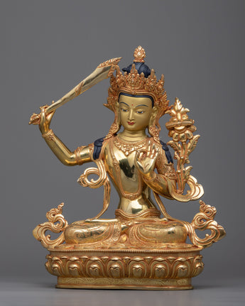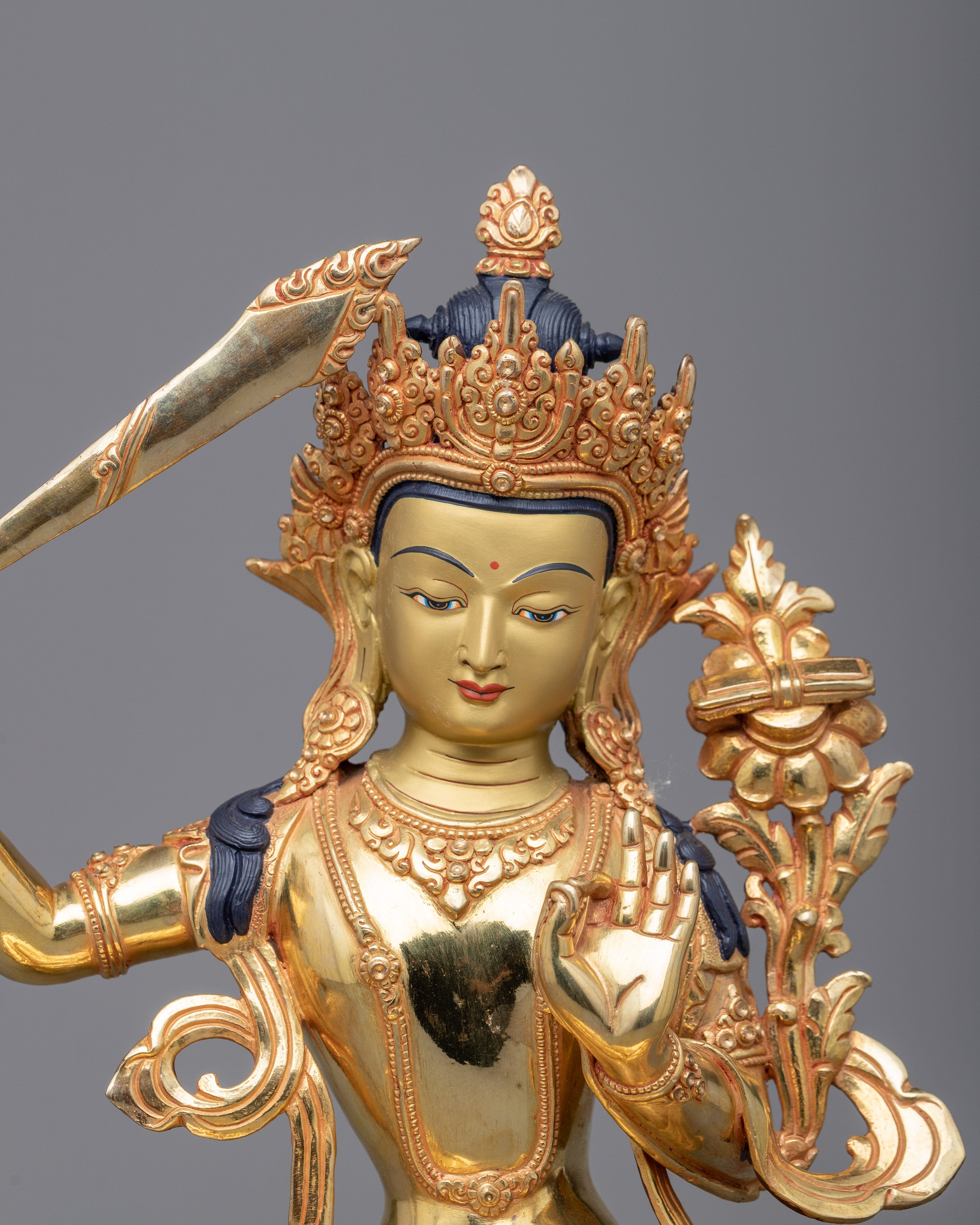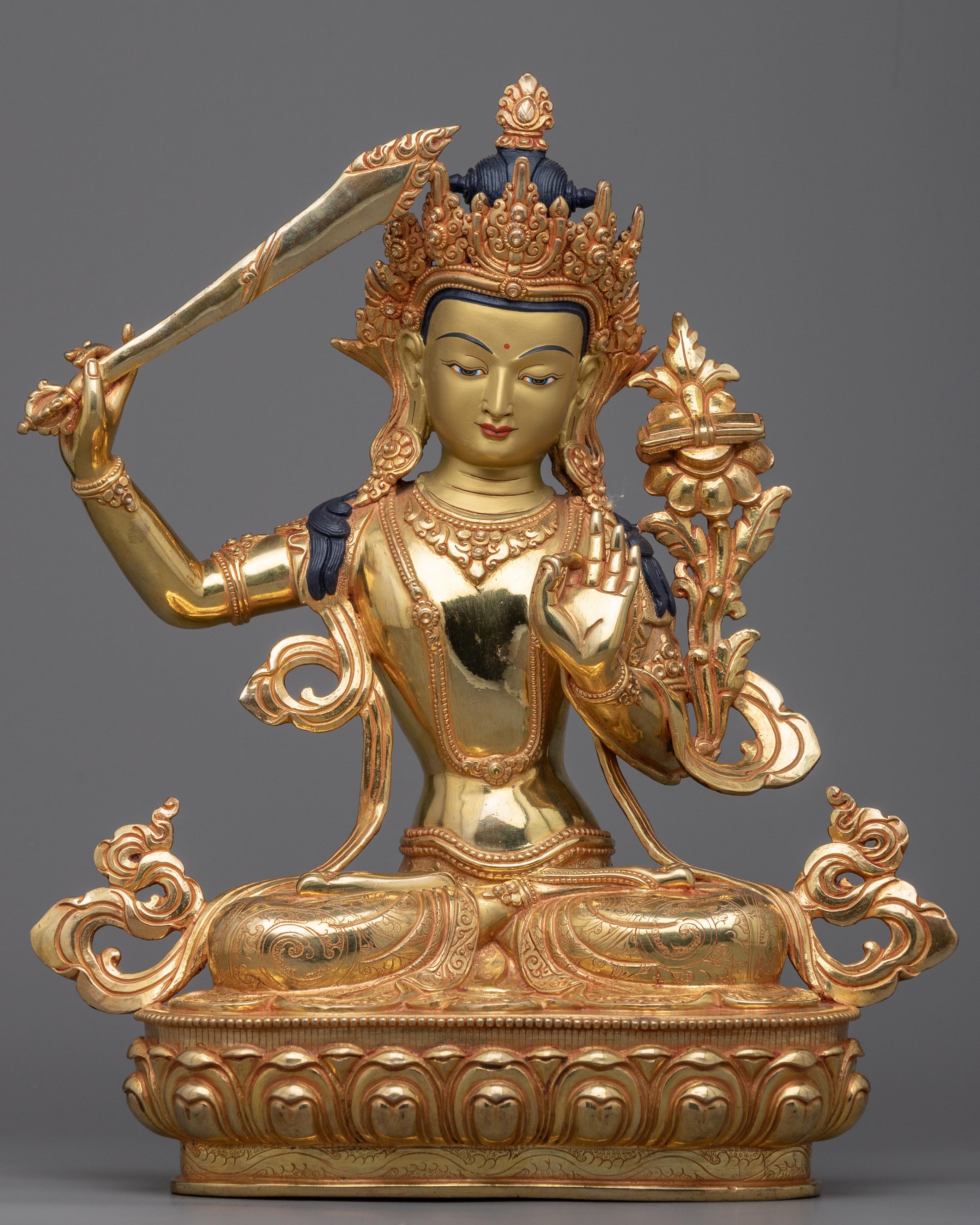 Manjushri Buddha Bodhisattva is seen carrying a blazing sword of wisdom, used to cut through ignorance and delusion, in his right hand while reclining in the full lotus position. He is holding a blue lotus blossom on his left palm, on which is lying the Prajnaparamita Sutra, a holy book that contains the Buddha's last teachings on knowledge.