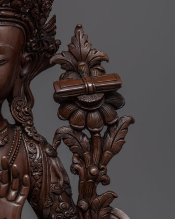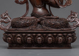 The Manjushri Empowerment Sculpture was expertly hand-crafted in Nepal in the traditional Himalayan manner. We have employed an oxidized copper to mold the deity. The deity is seen with a contented look sitting on a moon disc atop Lotus. He carries a flaming knowledge sword in his right hand and a lotus in his left. Generations have passed down the knowledge necessary to create such intricate Buddhist Deity statues. This work of art was created by hand over months.