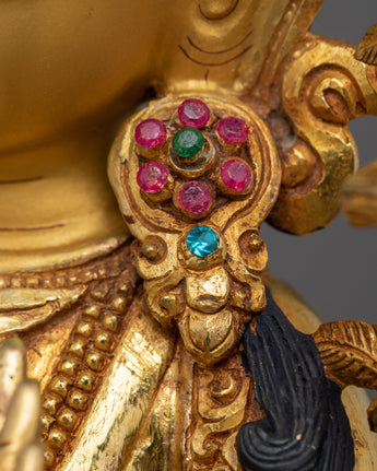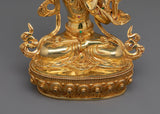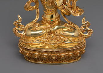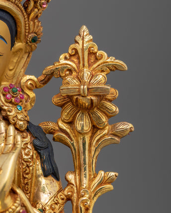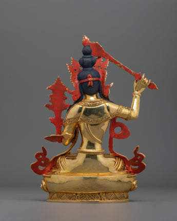 Manjushri is shown in a meditative pose, holding the sword of wisdom in his right hand and a sacred scriptures in his left, symbolizing the perfect union of knowledge and compassion. Each element is meticulously crafted by experienced artisans in Patan, Nepal, to combine both beauty and spiritual significance.